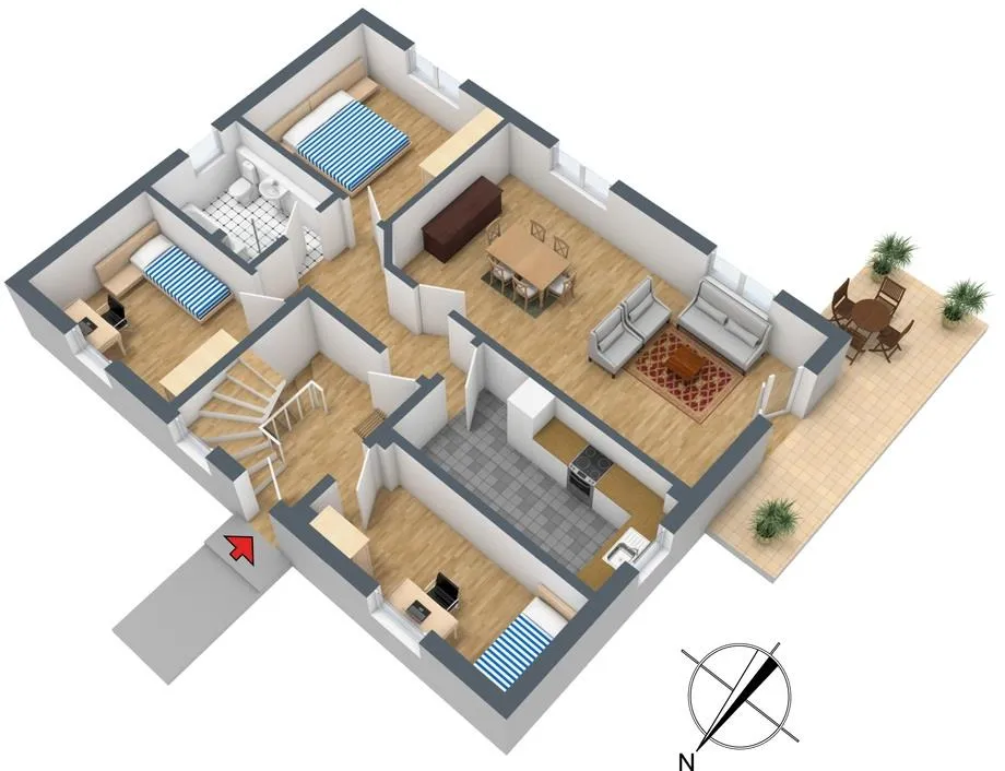 Der Grundriss ist sehr gut. Alle Räume sind direkt vom Flur begehbar. Das Badezimmer verfügt über ein Fenster. Die Süd-West Terrasse ist über das Wohnzimmer begehbar.