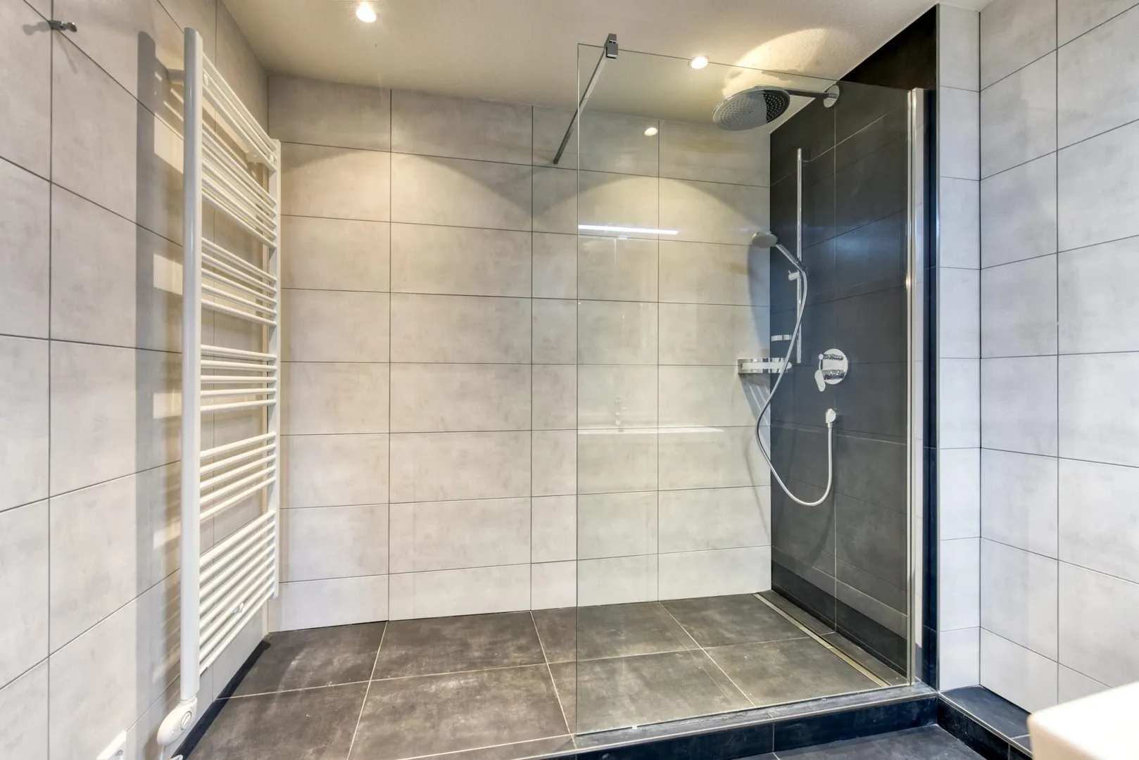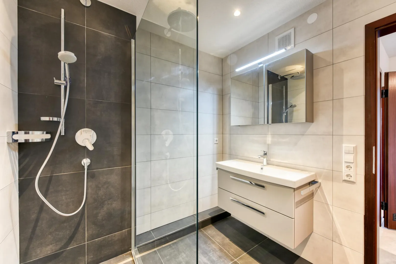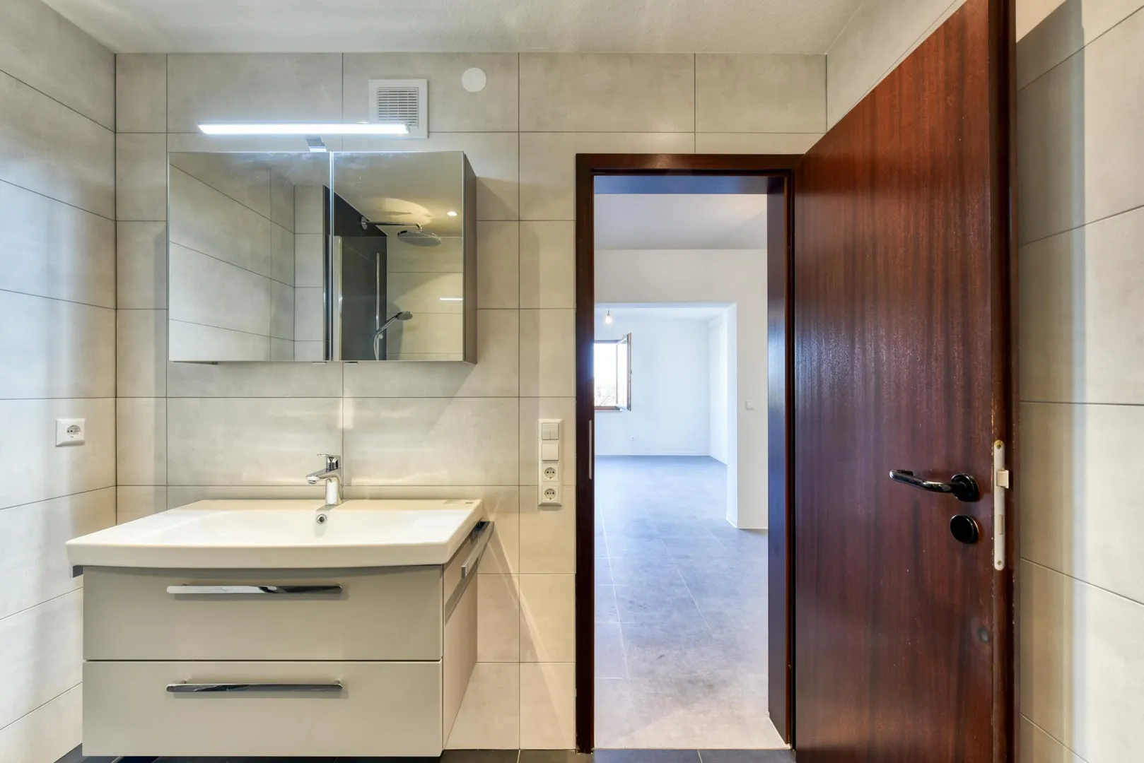 Das raumhoch geflieste Badezimmer ist ausgestattet mit einer Dusche, einem Handtuch-Heizkörper, einem belichteten Spiegelschrank, einem Waschtisch-Unterschrank sowie einer abgehängten Decke mit Belichtung.