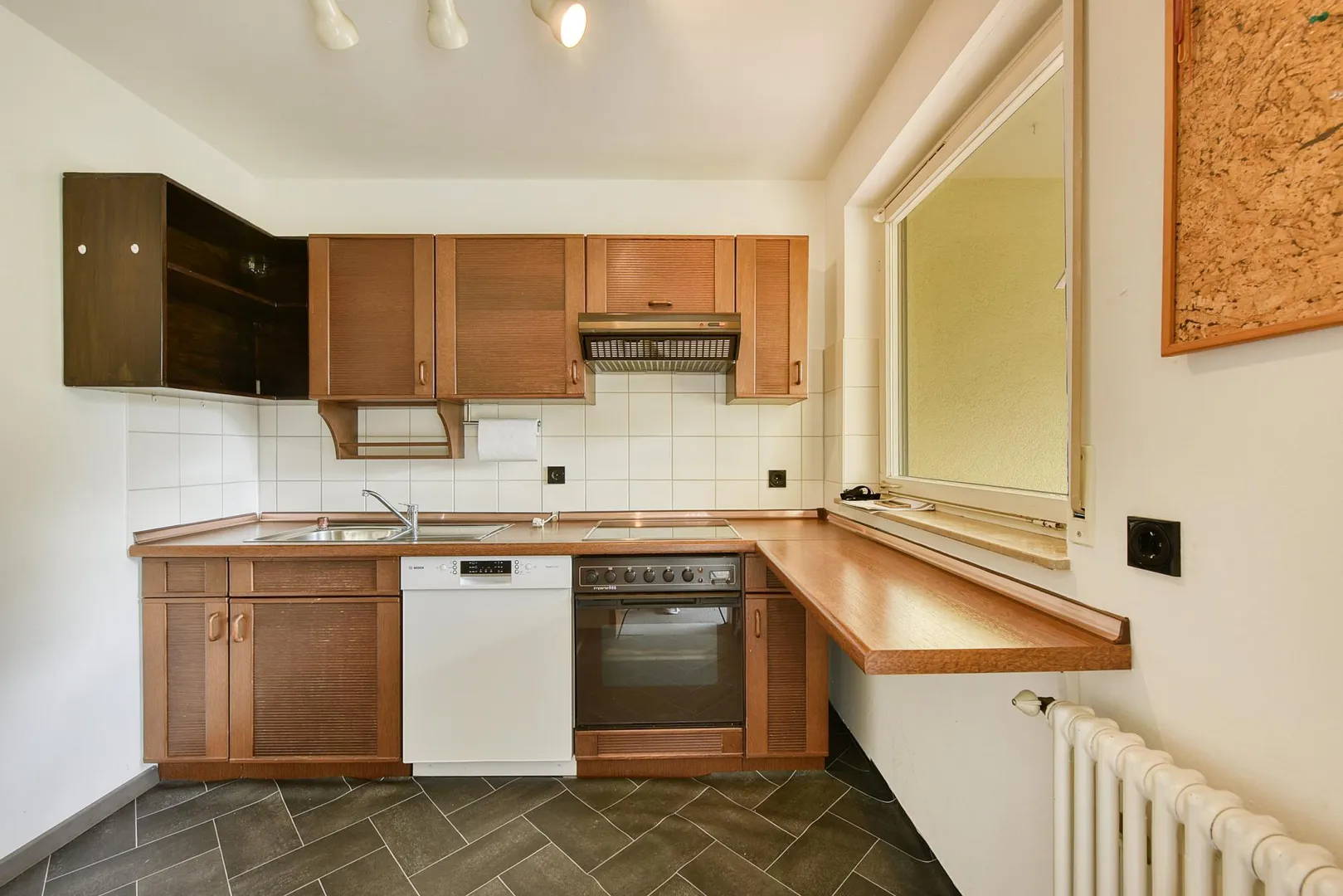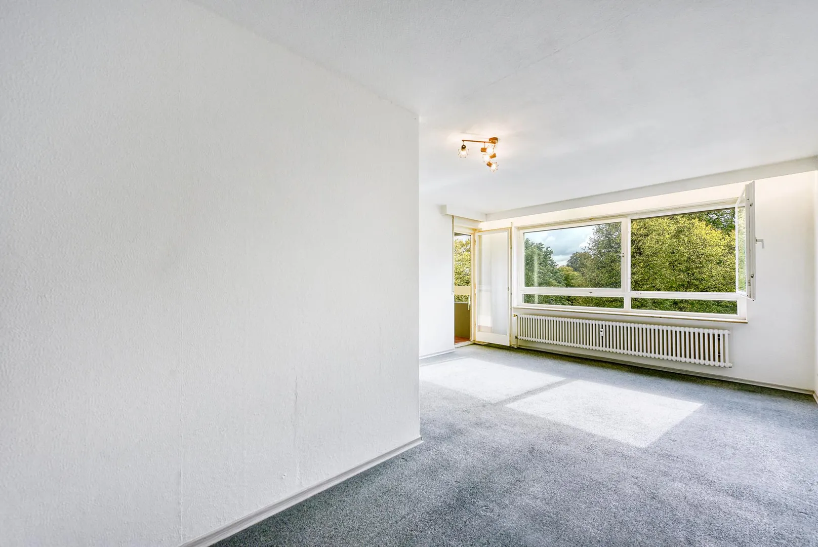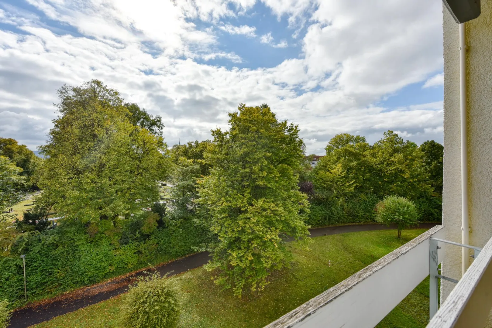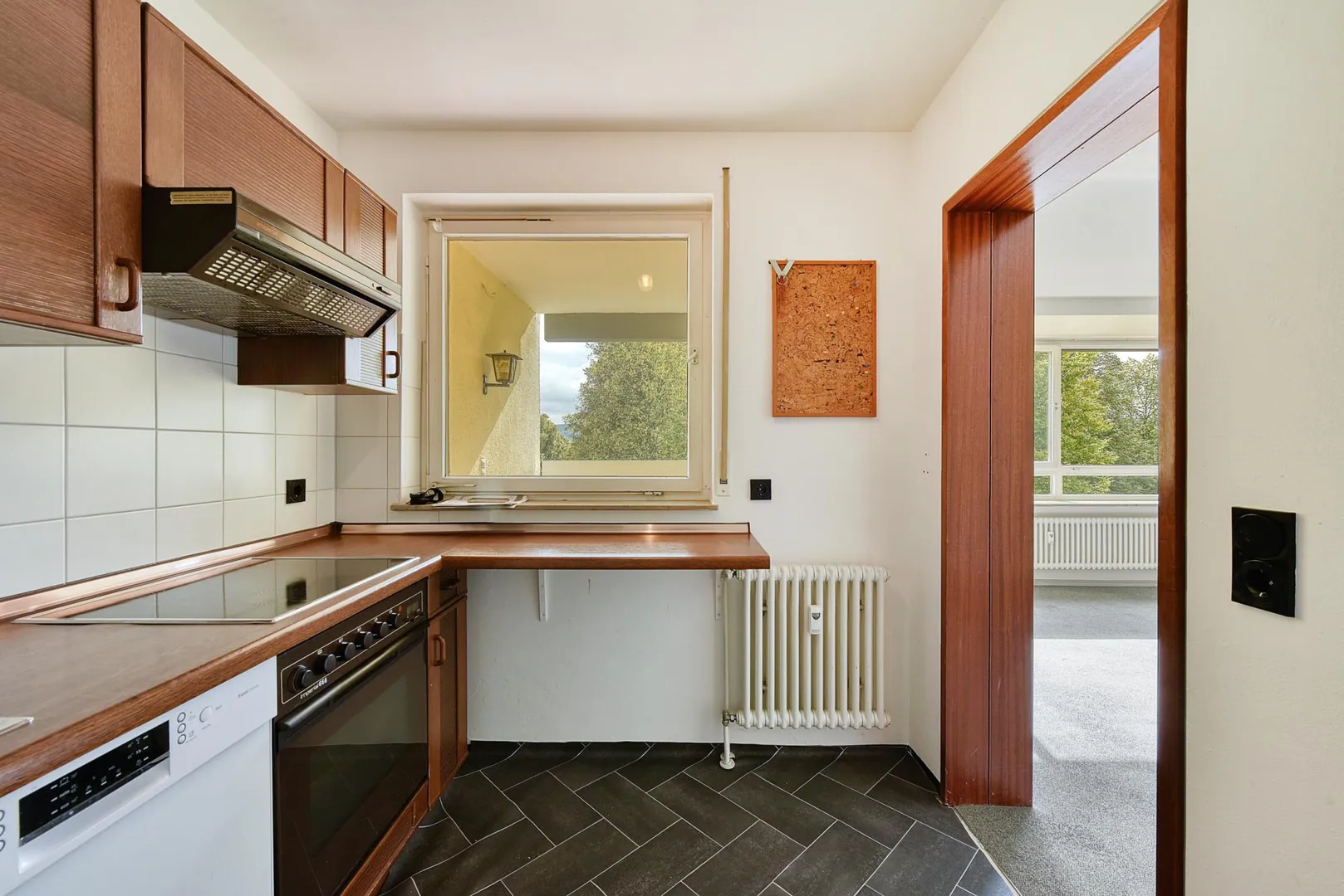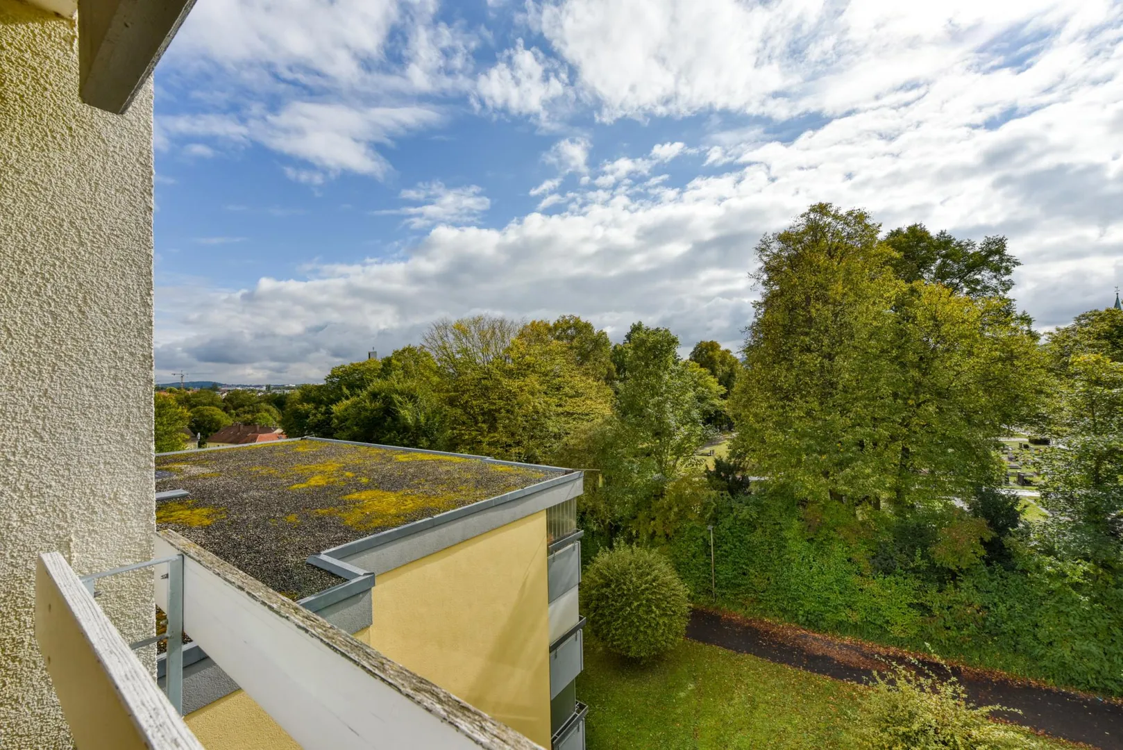 Das Wohnzimmer verfügt über eine breite Fensterfront, ist nach Süden ausgerichtet und hat einen Blick ins Grüne, zum Friedhof. Die Küche sowie der Balkon sind ebenso nach Süden ausgerichtet.