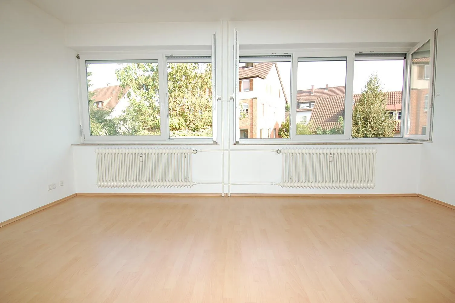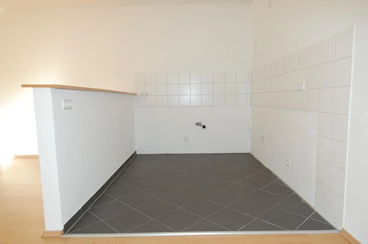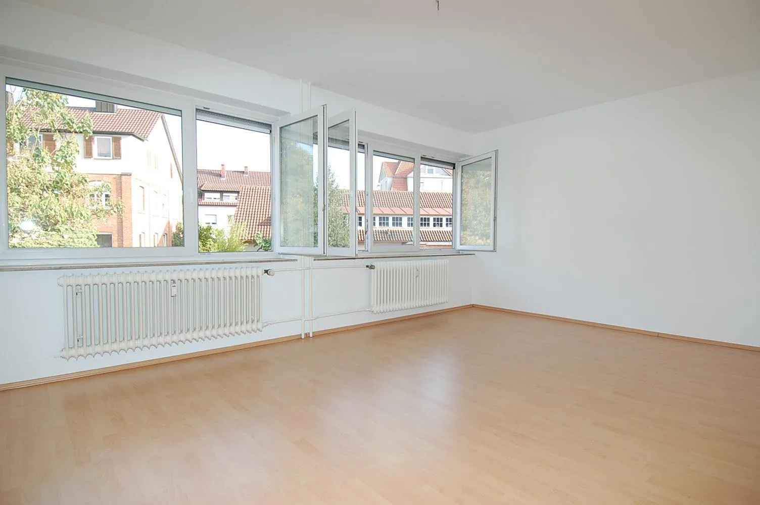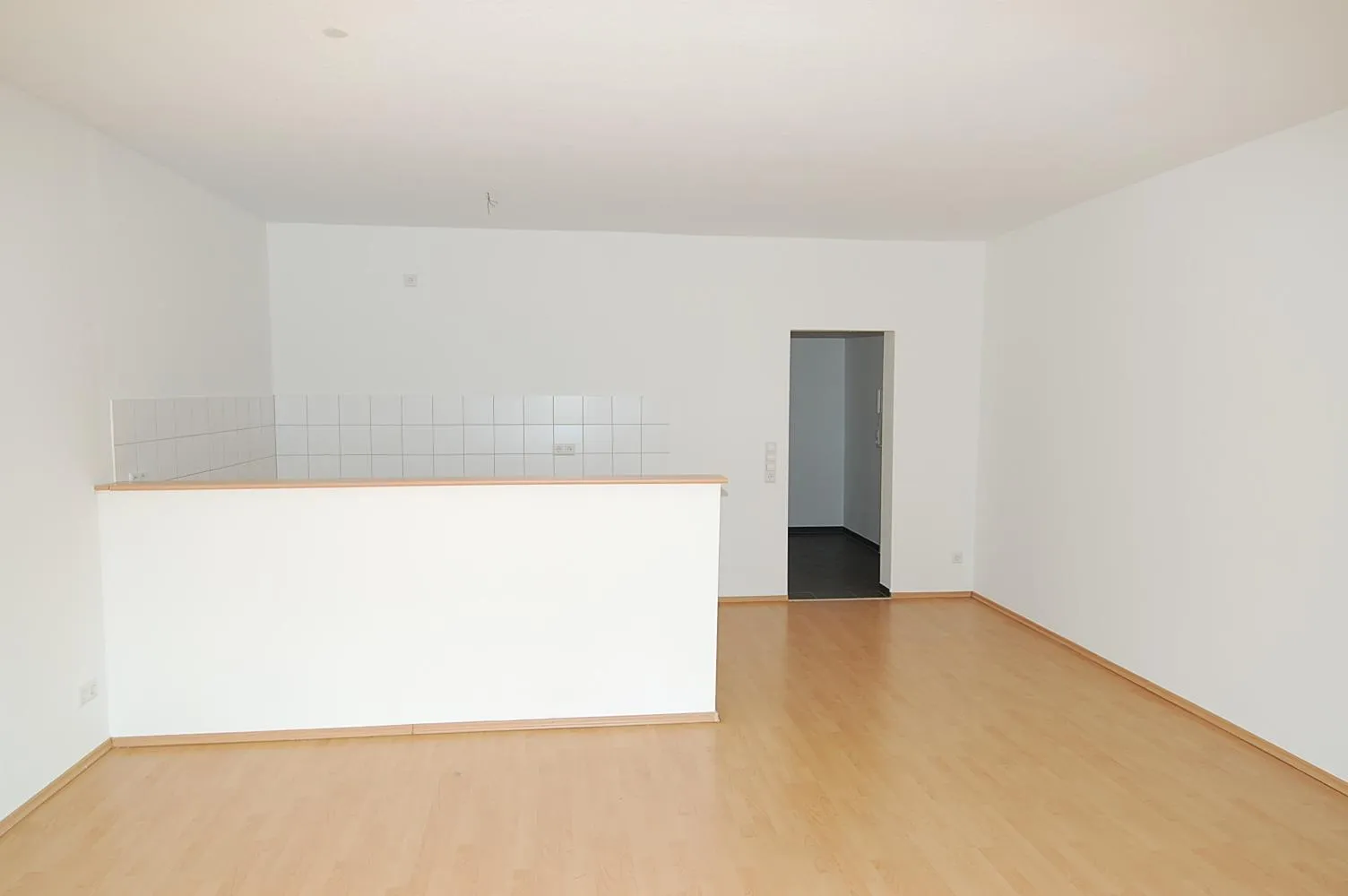 Der Wohn- und Essbereich ist mit Laminat ausgestattet und verfügt über eine offene Küche.