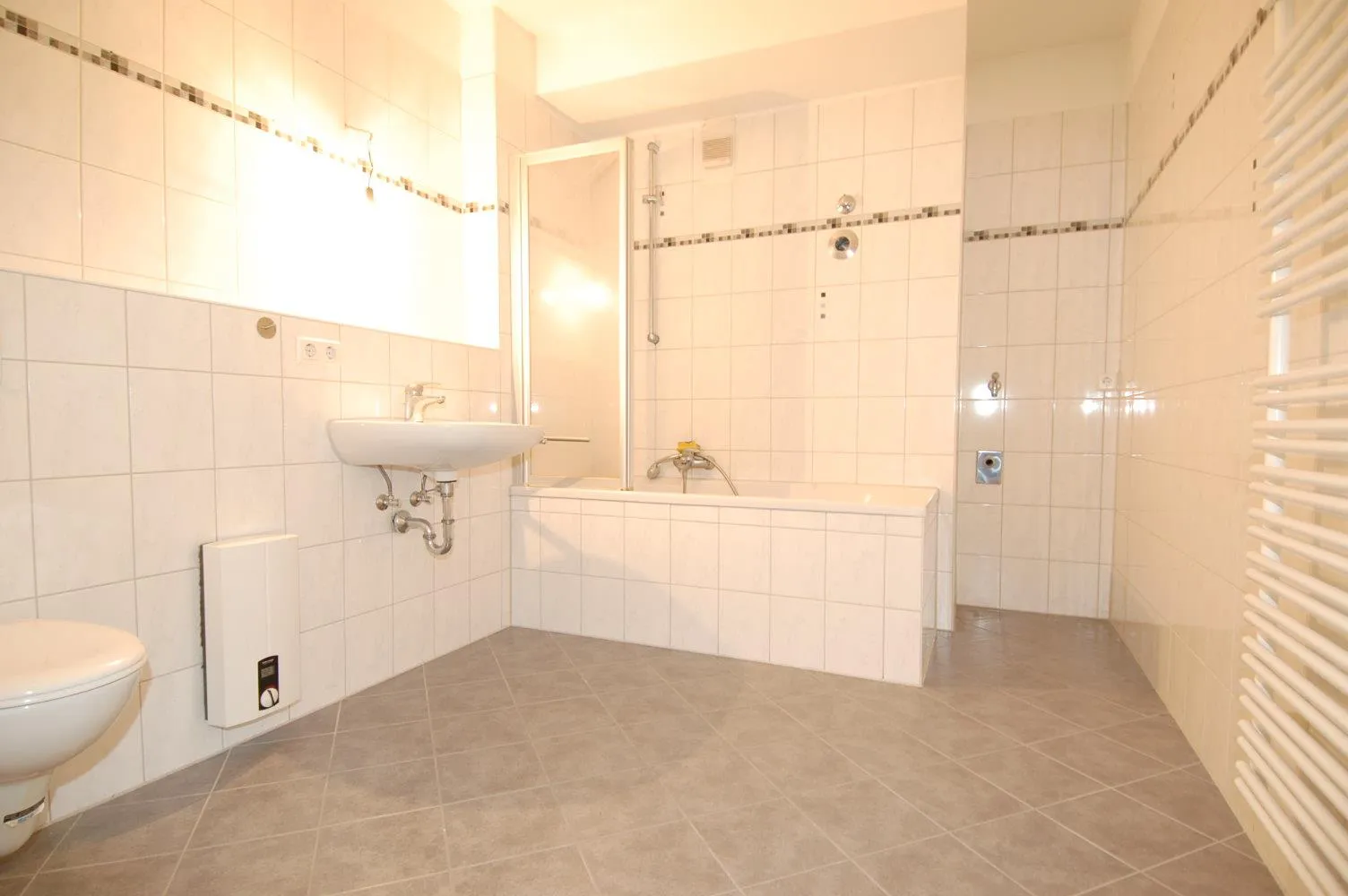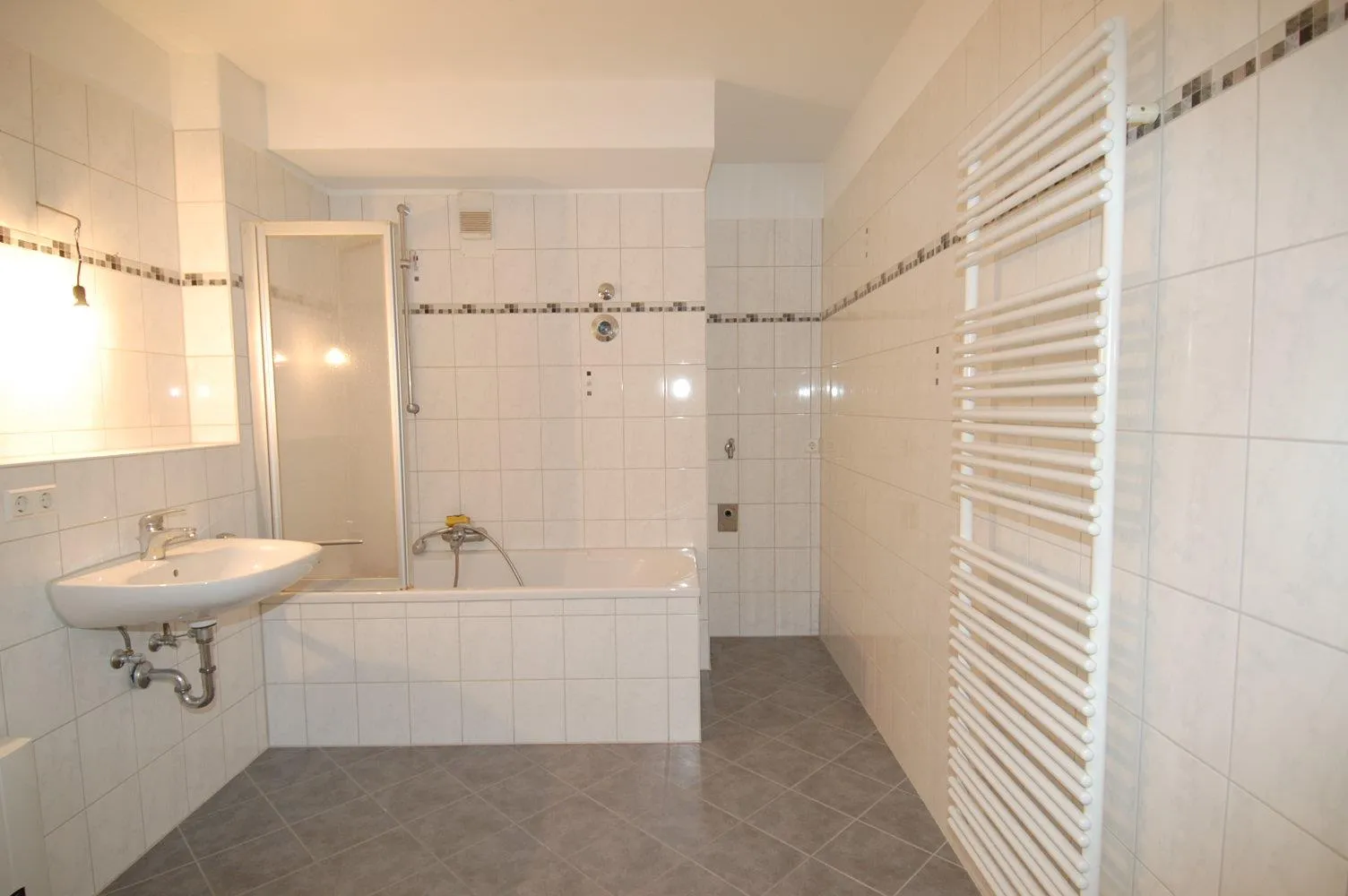 Das Badezimmer ist raumhoch gefliest, mit einer Wanne, Waschbecken, WC und Handtuchheizkörper ausgestattet. Zusätzlich gibt es im Badezimmer einen Waschmaschinenanschluss.