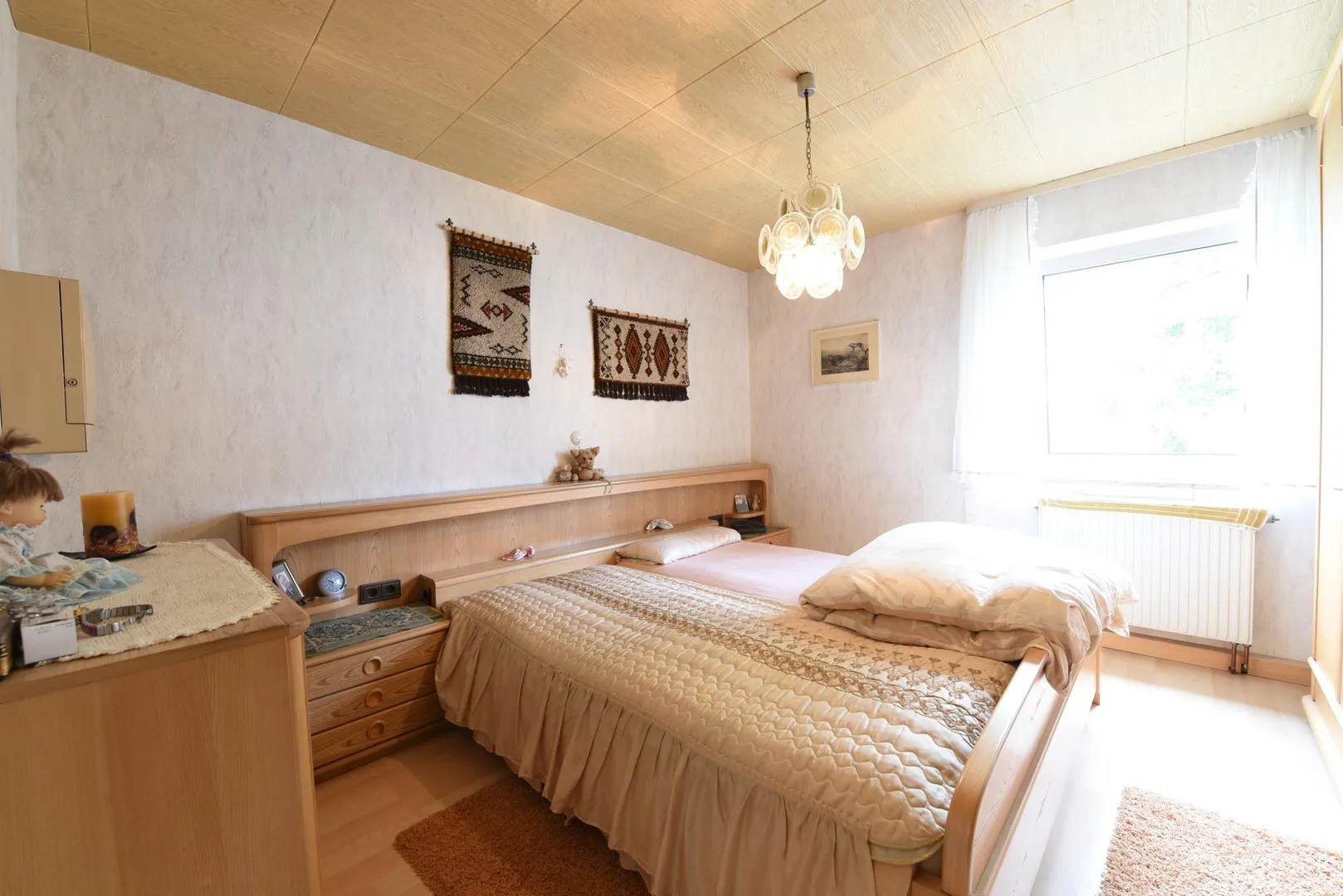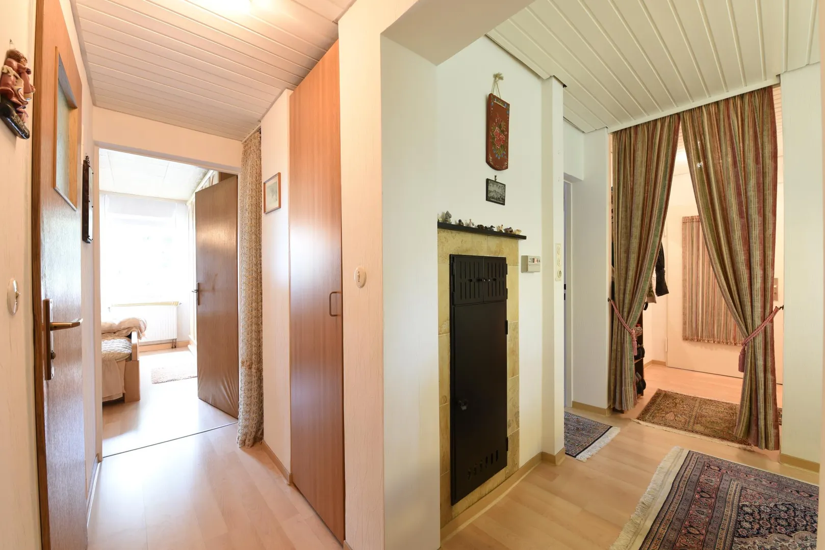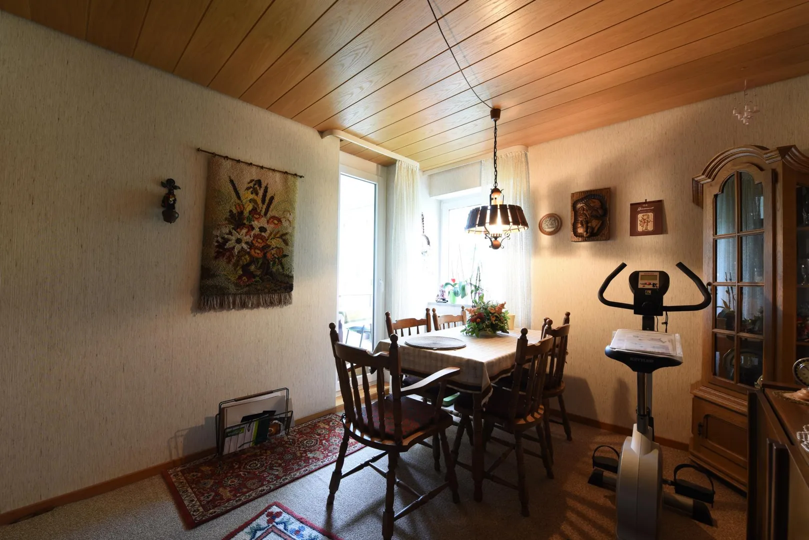 Im Wohnzimmer sowie im Arbeitszimmer ist ein Teppichboden verlegt. Die Decken sind überwiegend mit Holz-Paneelen verkleidet. Die Wände sind überwiegend mit Struckturtapeten tapeziert.