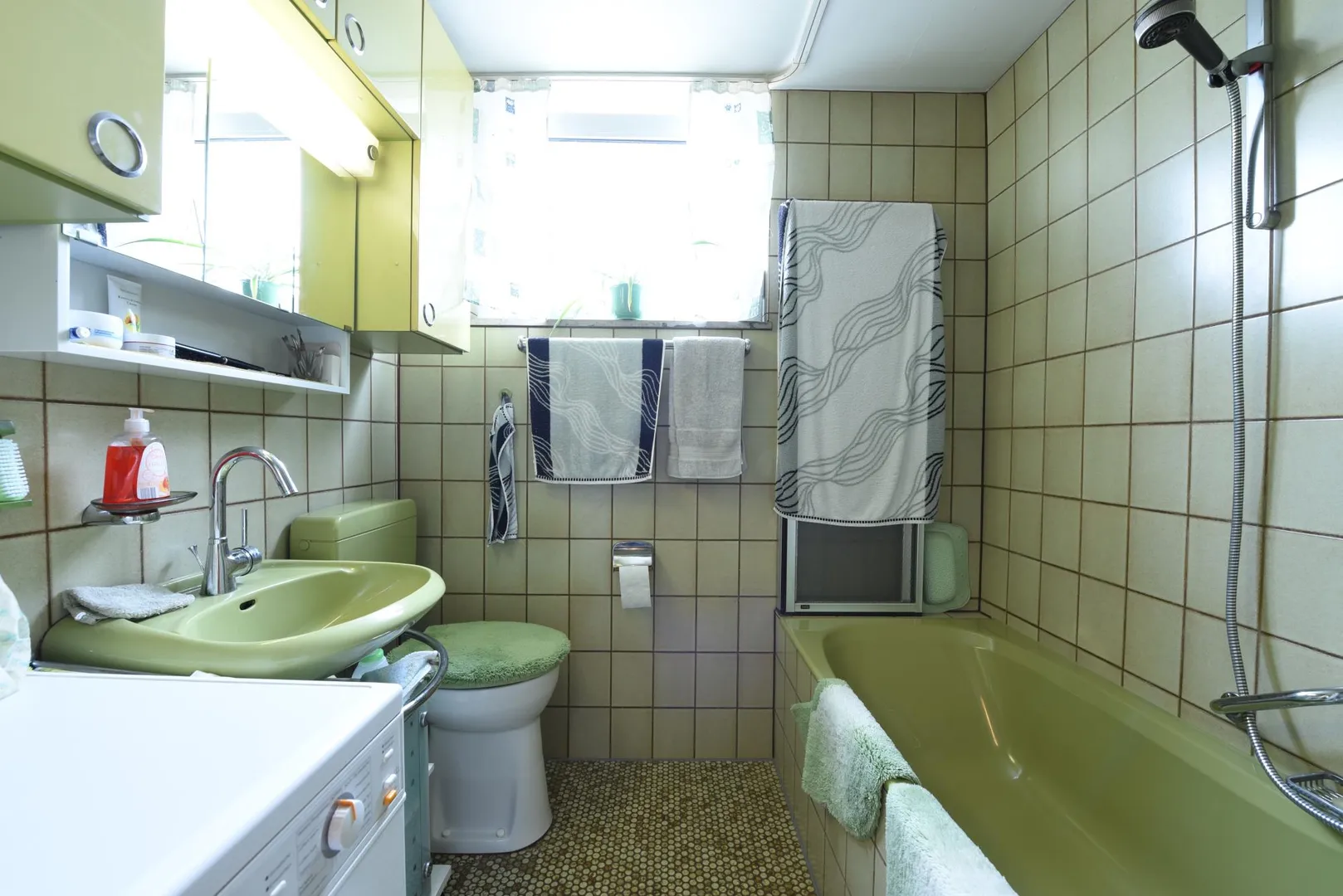 Das Badezimmer mit Fenster sowie die Elektrik sind aus dem Ursprungsbaujahr.