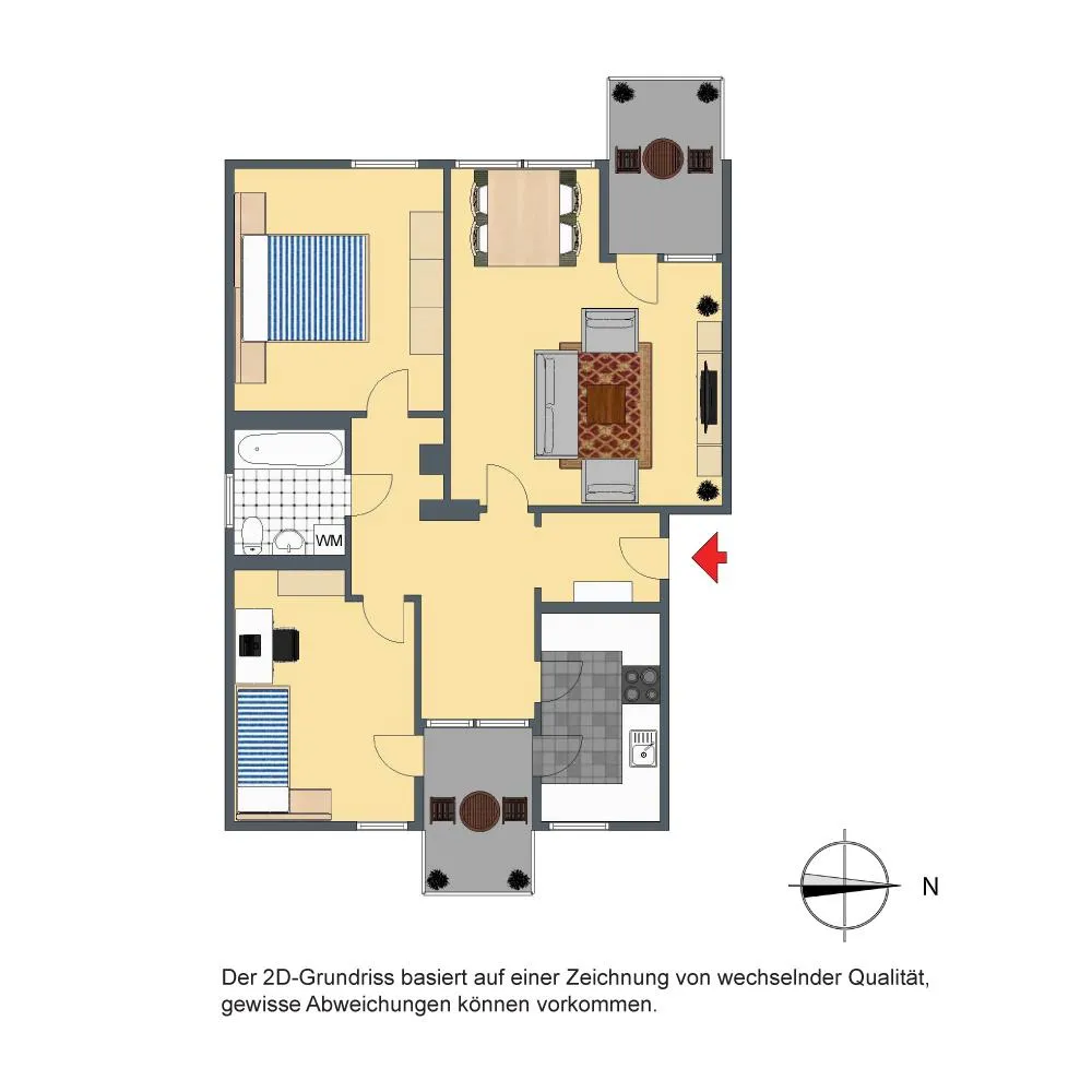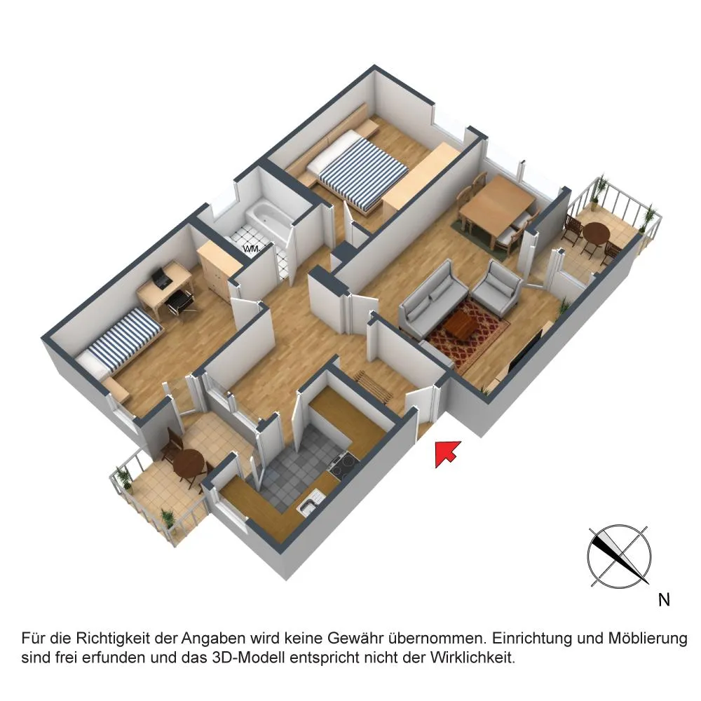 Der Grundriss der Wohnung ist gut. Alle Räume sind direkt vom Flur begehbar. Der teilüberdachte ca. 6 m² große West-Balkon ist über das Wohnzimmer begehbar. Der teilüberdachte ca. 5 m² große Nord-Balkon ist über die Küche und über das Arbeitszimmer begehbar.