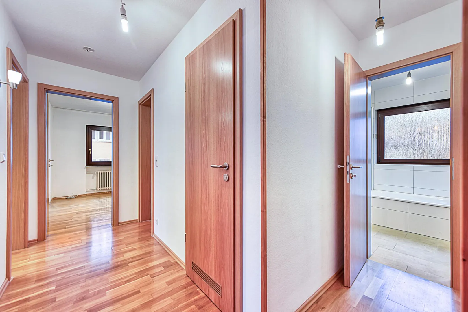 Die Wände sind überwiegend mit Raufasertapete tapeziert und frisch, weiß gestrichen. Die Raumhöhen betragen ca. 2,42 Meter.