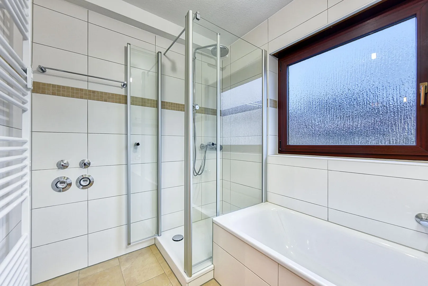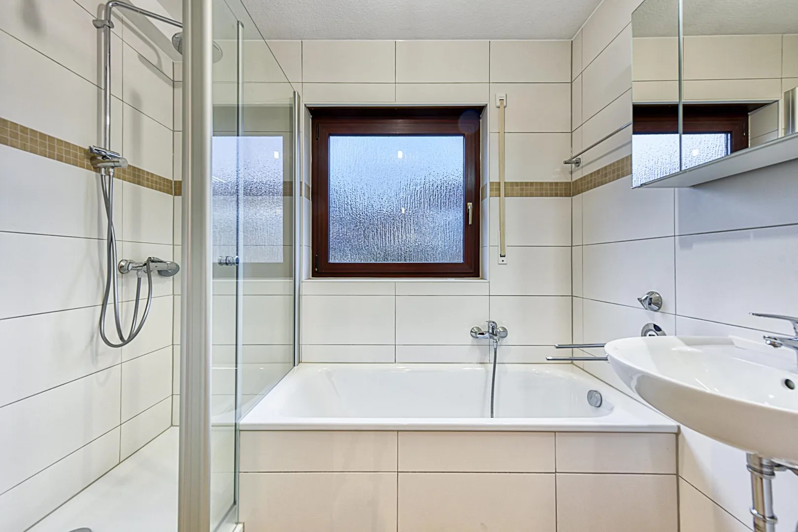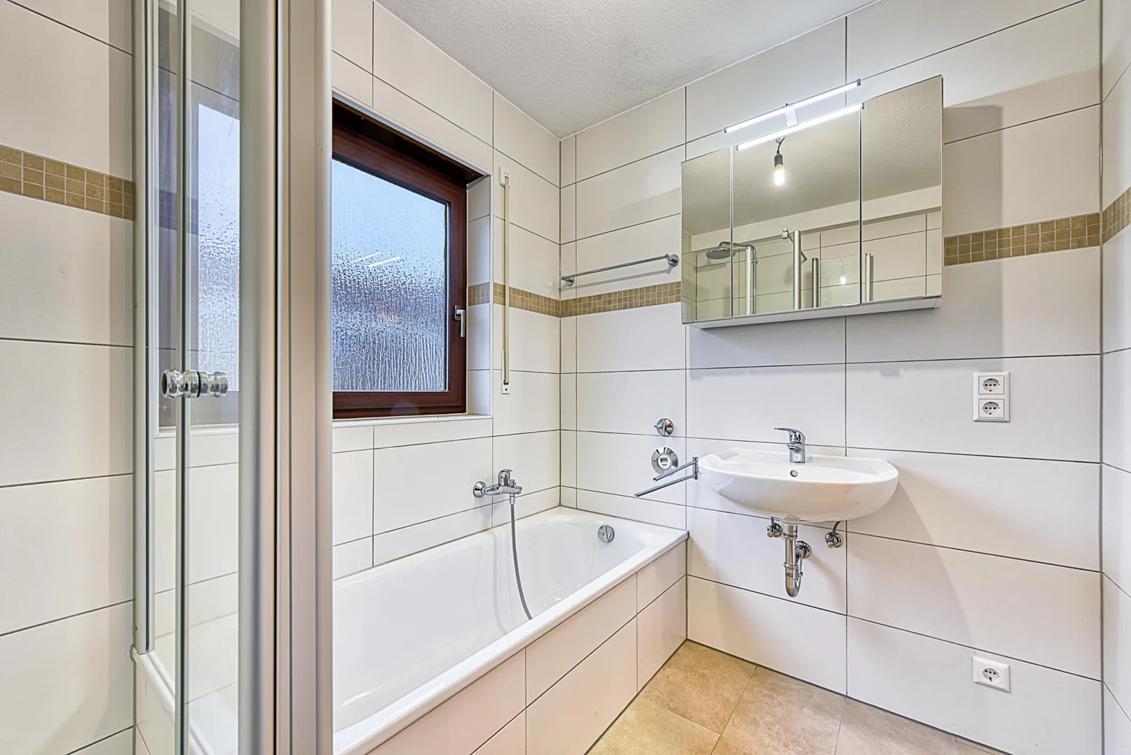 Das raumhoch geflieste Tageslicht-Badezimmer ist ausgestattet mit einer Badewanne, einer Dusche, einem Handtuch-Heizkörper sowie einem Spiegelschrank.