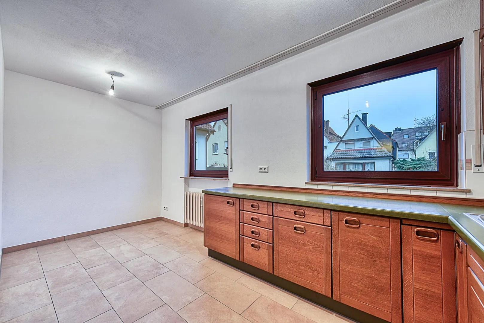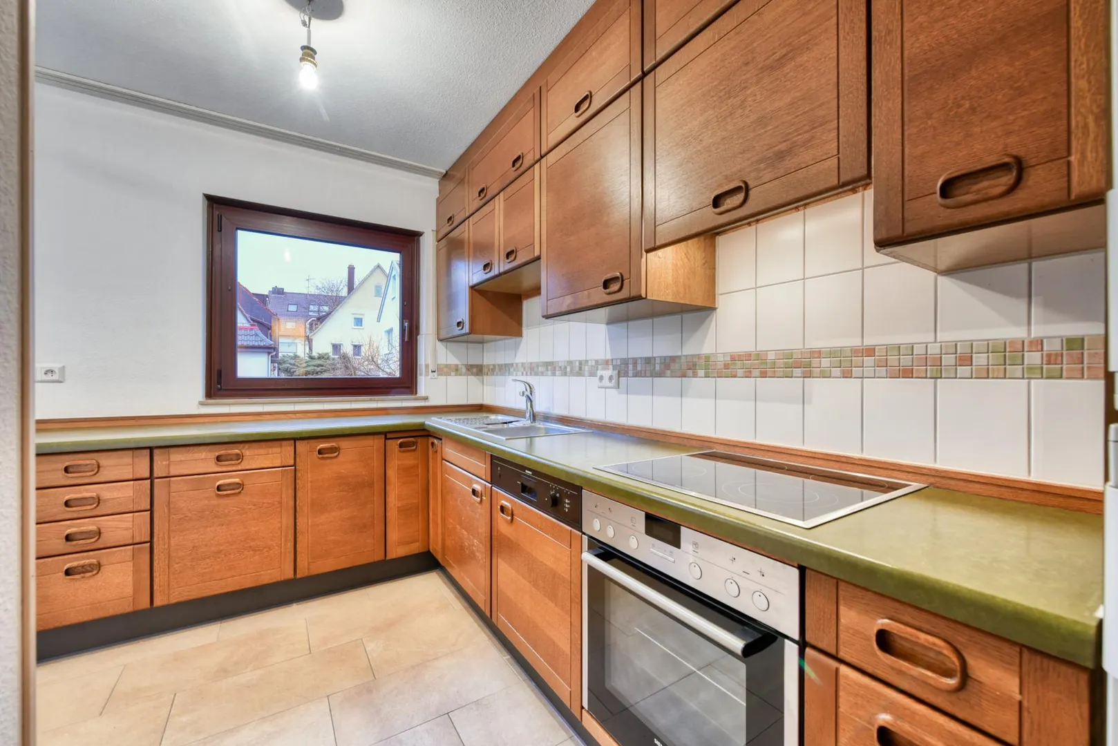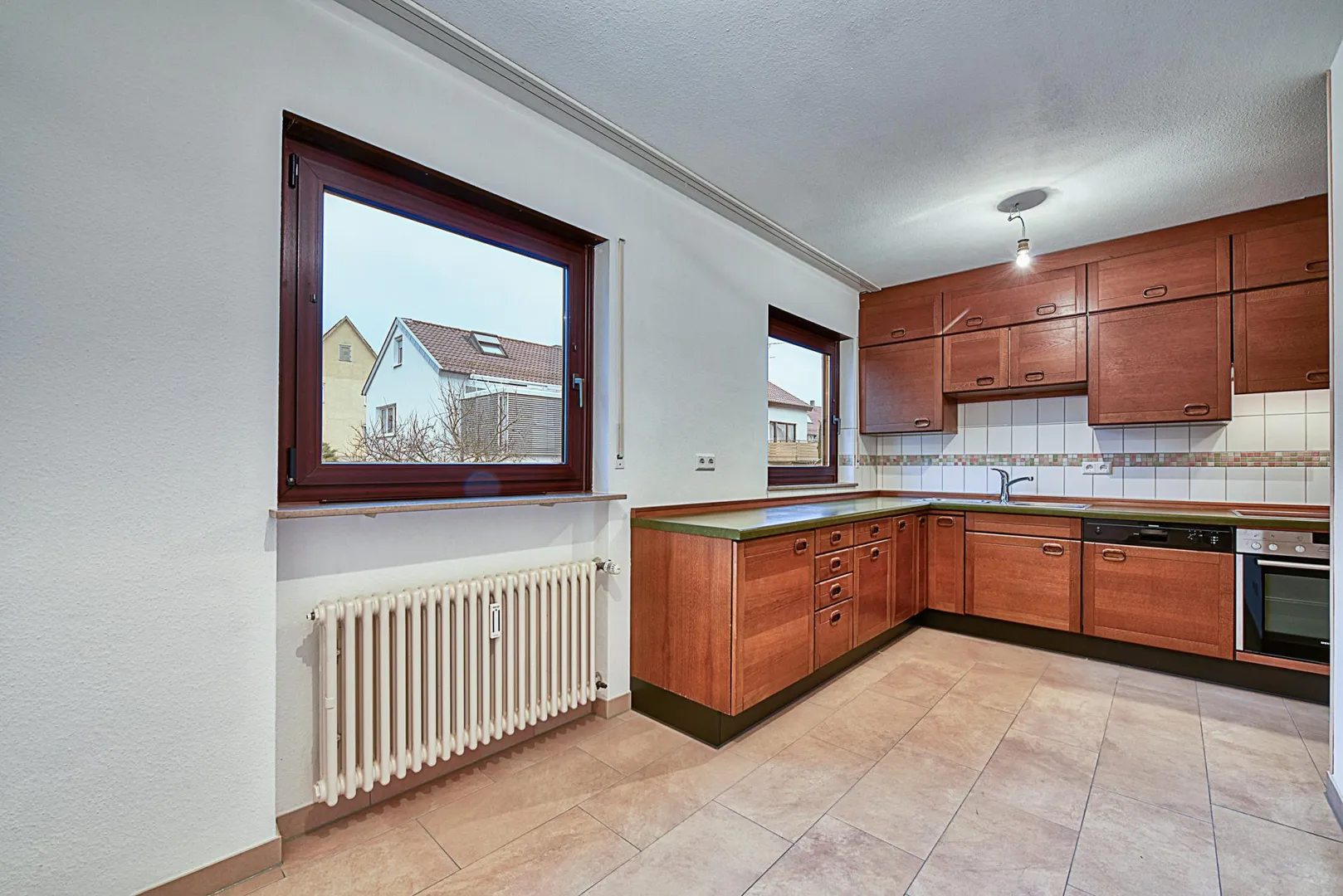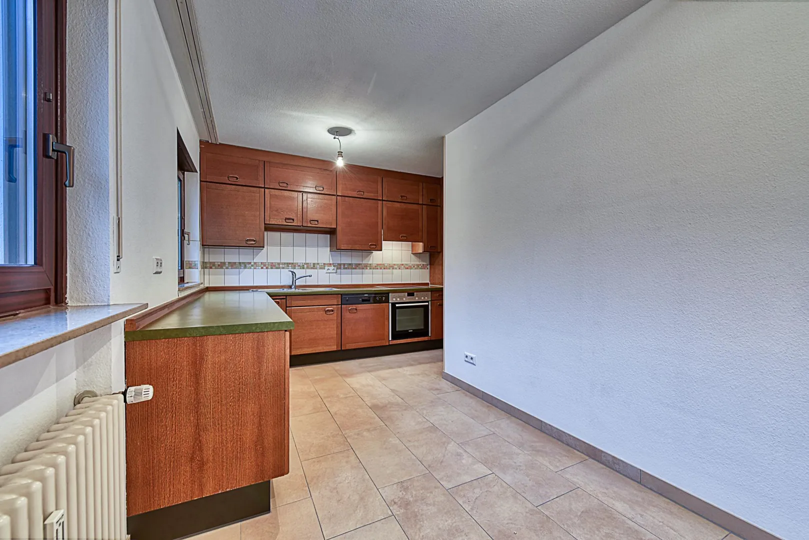 Die Küche ist ausgestattet mit einer Essecke, einem Außenabzug sowie einer Einbauküche mit modernisierten Elektrogeräten sowie einer älteren Holzoptik. Der Herd mit Backofen ist 2 Jahre alt und ist mit Pyrolyse (Selbstreinigung) ausgestattet. Bei Bedarf kann eine eigene Einbauküche auf eigene Kosten eingebaut werden.