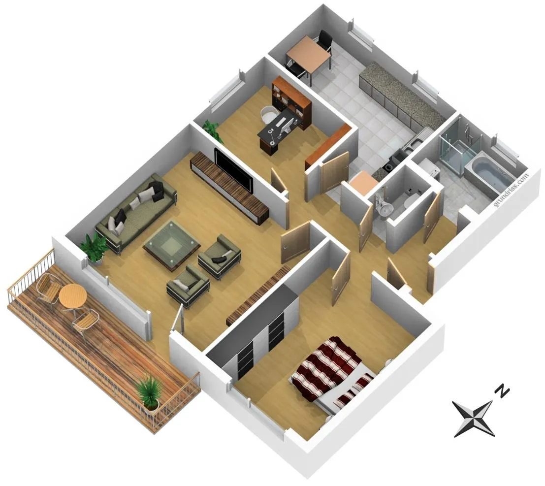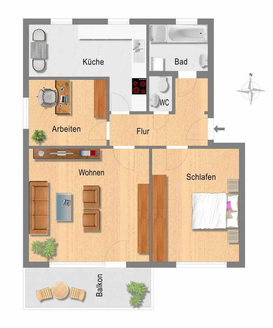 Das Wohnzimmer, das Schlafzimmer sowie der Balkon sind nach Süden ausgerichtet. Das Arbeits-/Kinderzimmer ist nach Westen ausgerichtet. Die Küche sowie das Badezimmer sind nach Norden ausgerichtet. Das WC ist innenliegend.