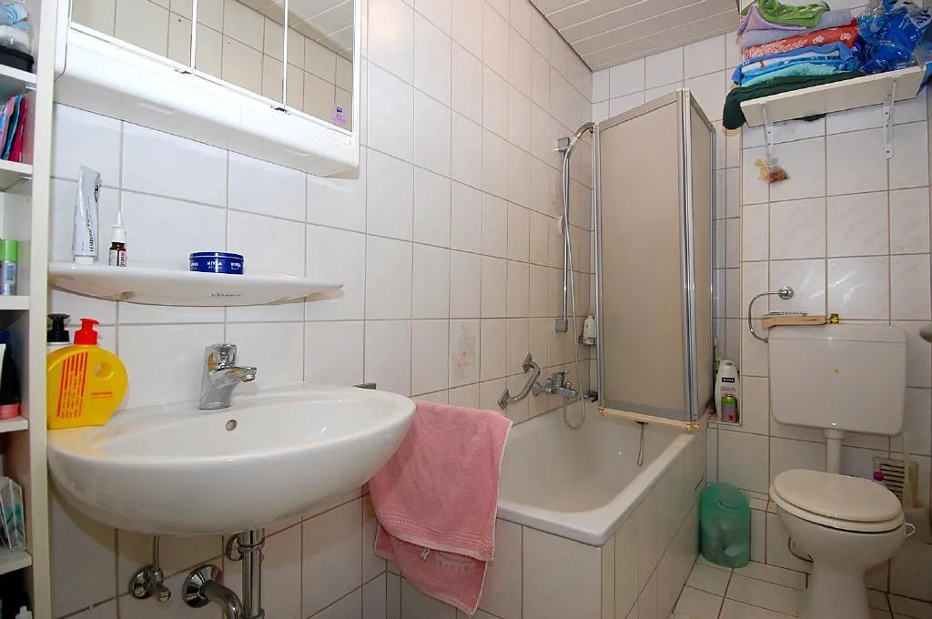 Das Bad ist raumhoch gefliest und ist mit einem Fliesenboden, einer Wanne, einem Waschbecken und einem WC ausgestattet.