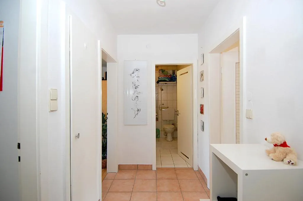 Der Flur verfügt über einen Fliesenboden,welcher 2007 erneuert wurde, einen Einbauschrank und Raufasertapete.