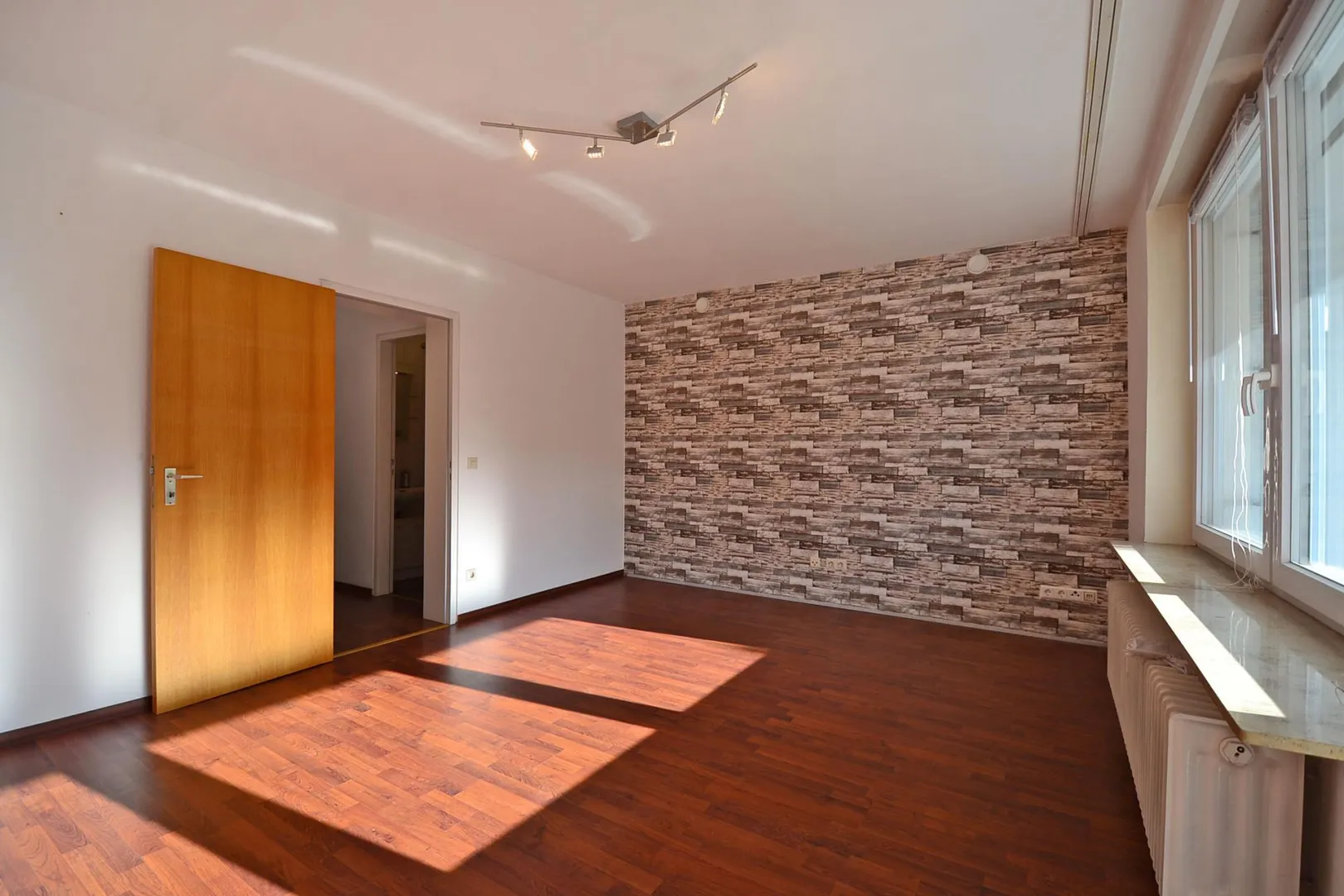 Die Wände sind mit Raufasertapeten tapeziert und befinden sich in einem gepflegten Zustand. An einer Wand des Wohnzimmers ist eine Deko-Tapete in Steinmauer-Optik angebracht.