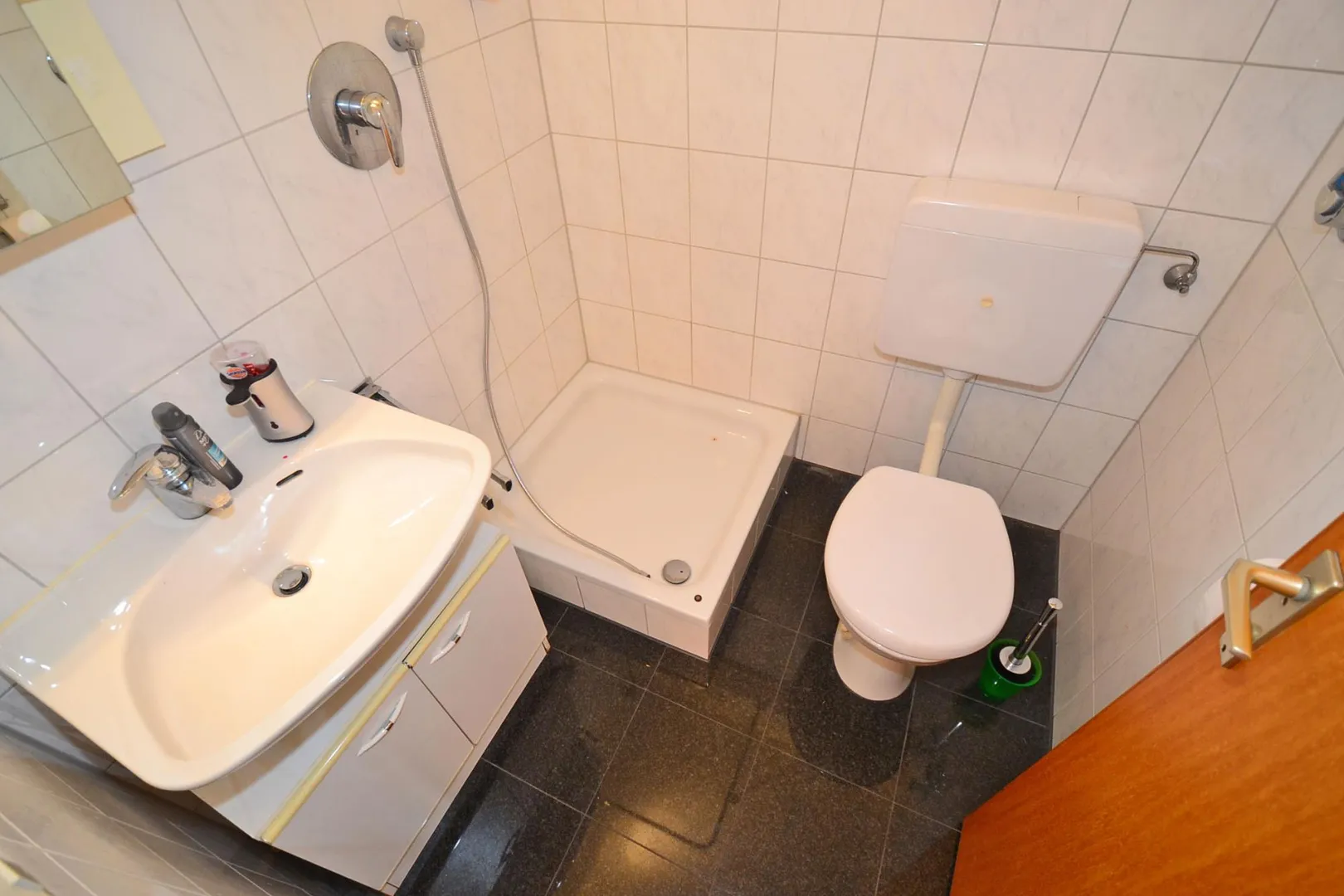 Das kompakte Bad wurde 2007 renoviert. Es ist raumhoch weiß gefliest und mit anthrazitfarbenem Granitboden, einer Dusche, einem Waschbecken mit Unterschrank und Spiegelschrank, einem WC, einem Handtuchheizkörper sowie mit einer Lüftung ausgestattet.
