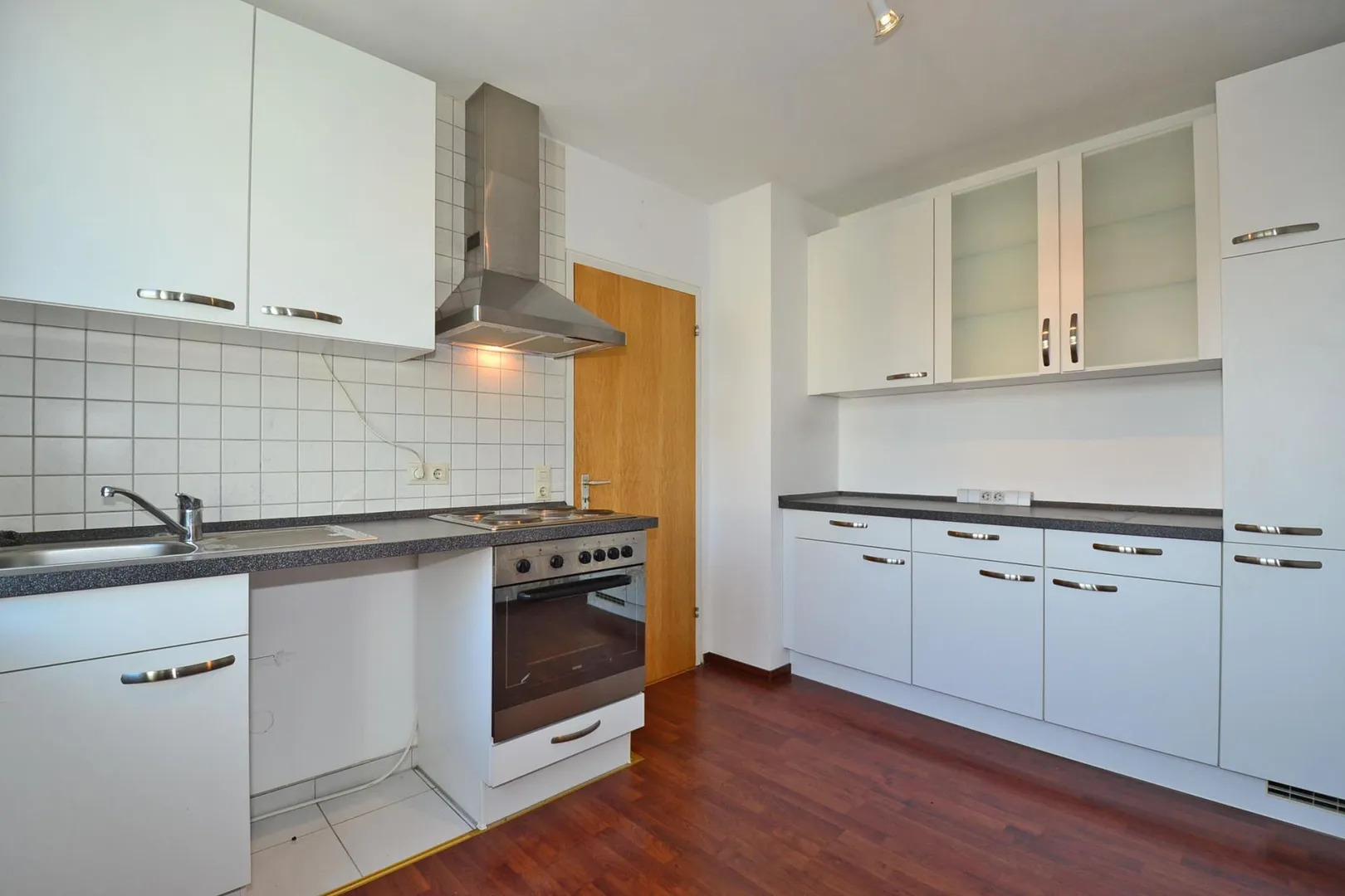 Die geräumige Küche bietet Platz für einen Esstisch. Eine Einbauküche ist vorhanden und ausgestattet mit einem Elektroherd, einem Backofen, einem Umluft-Dunstabzug, einer Spüle, einem Kühlschrank mit Gefrierfach, Ober- und Unterschränken sowie einem Waschmaschinenanschluss.