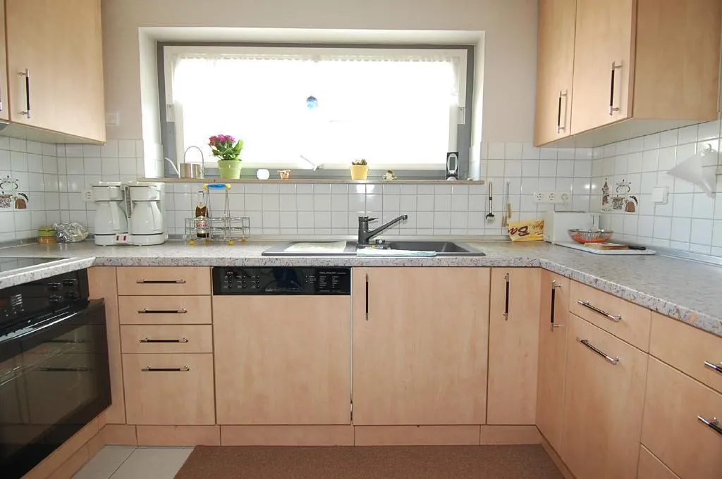 Die Küche verfügt über einen Abzug nach außen, ein großes längliches Fenster und ein seitliches Fenster, sowie über eine Schiebetür.