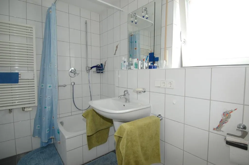 Das Badezimmer ist raumhoch gefliest. Es ist ausgestattet mit einem Fliesenboden, mit einer Dusche, einem WC, einem Handtuchheizkörper und einem Waschmaschinenanschluß.