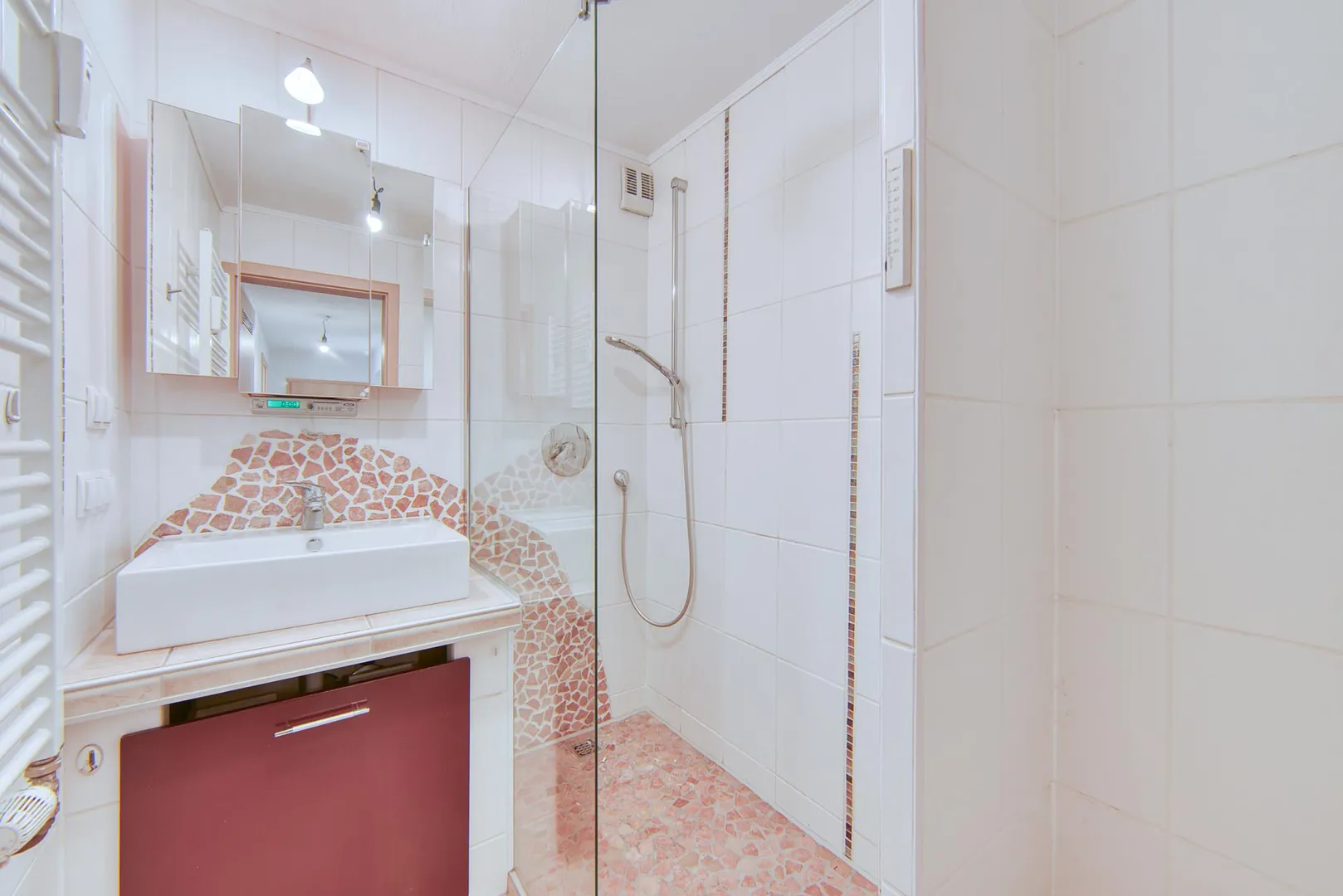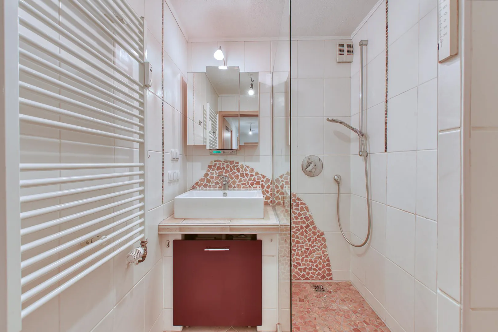 Das raumhoch geflieste Badezimmer verfügt über eine bodentiefe Dusche, einen Handtuch-Heizkörper sowie einen belichteten Spiegelschrank.