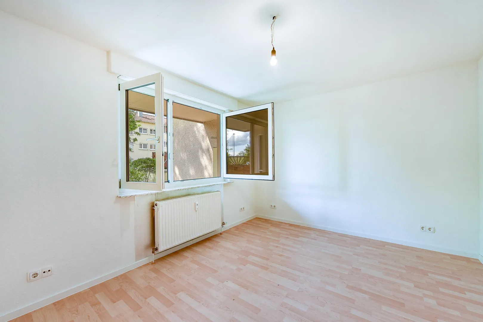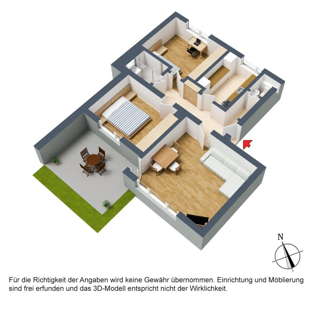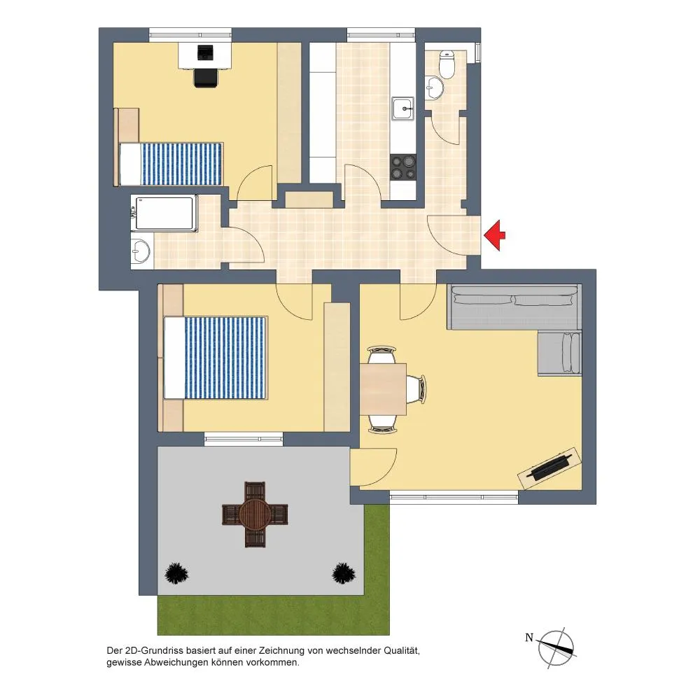 Der Grundriss ist gut: alle Räume sind direkt vom Flur begehbar. Die teilüberdachte, ca. 14 m² große West-Terrasse sowie der ca. 10 m² große Garten sind über das Wohnzimmer begehbar. Das WC mit Fenster ist separat. Das Badezimmer ist innenliegend.