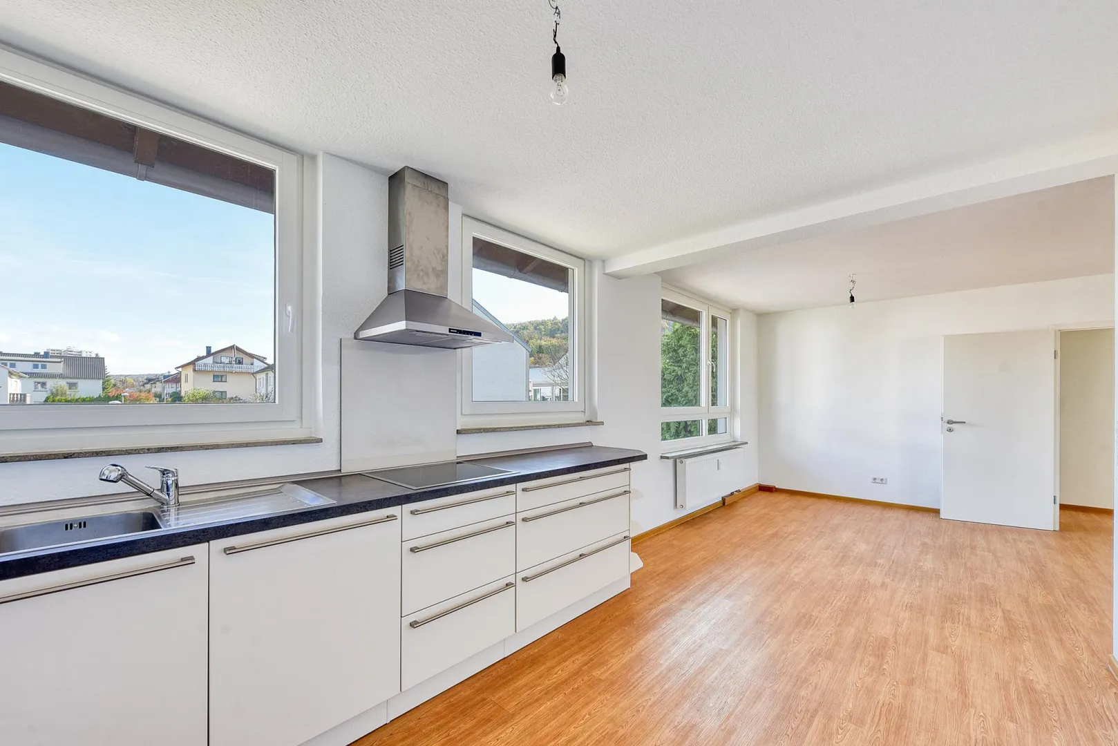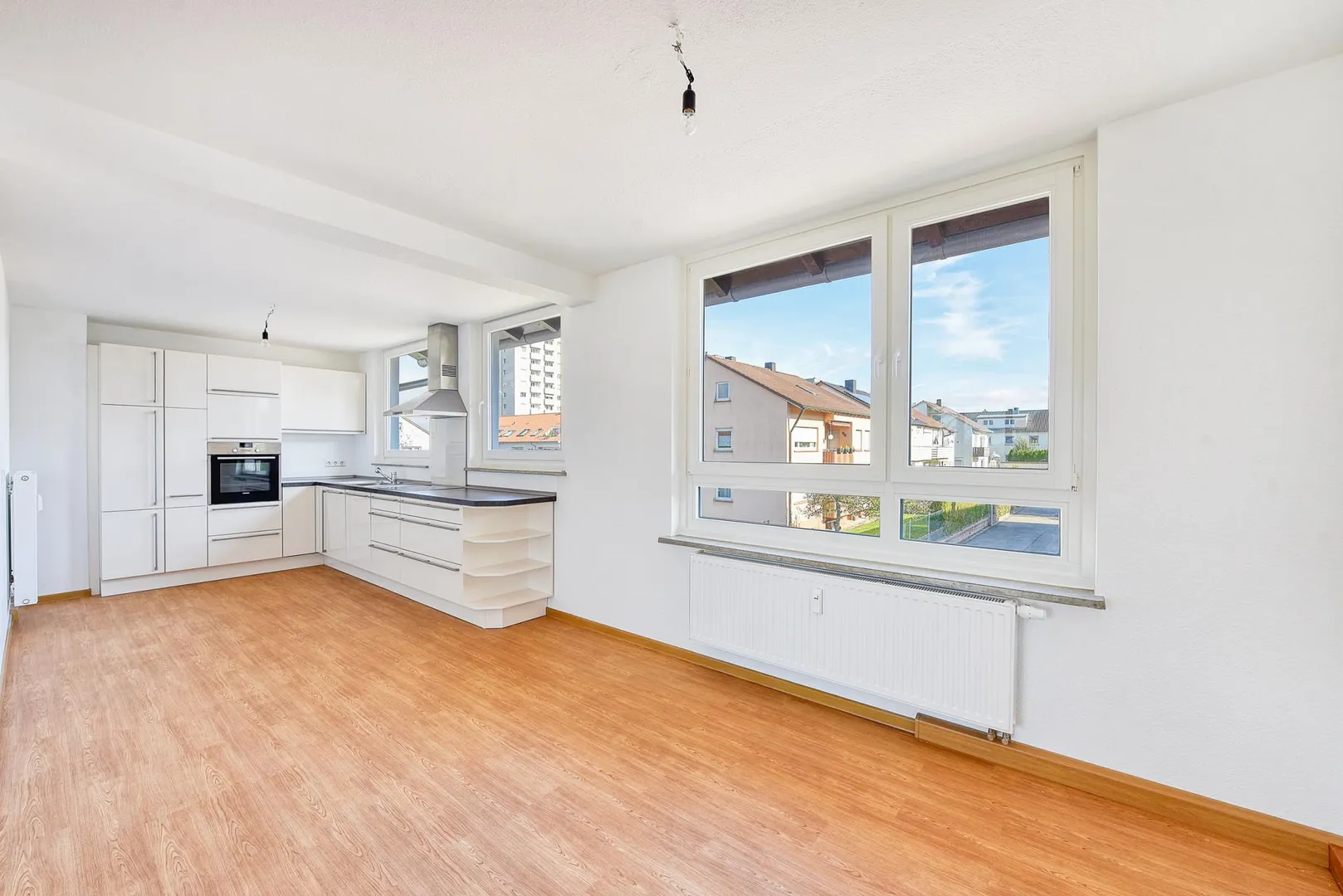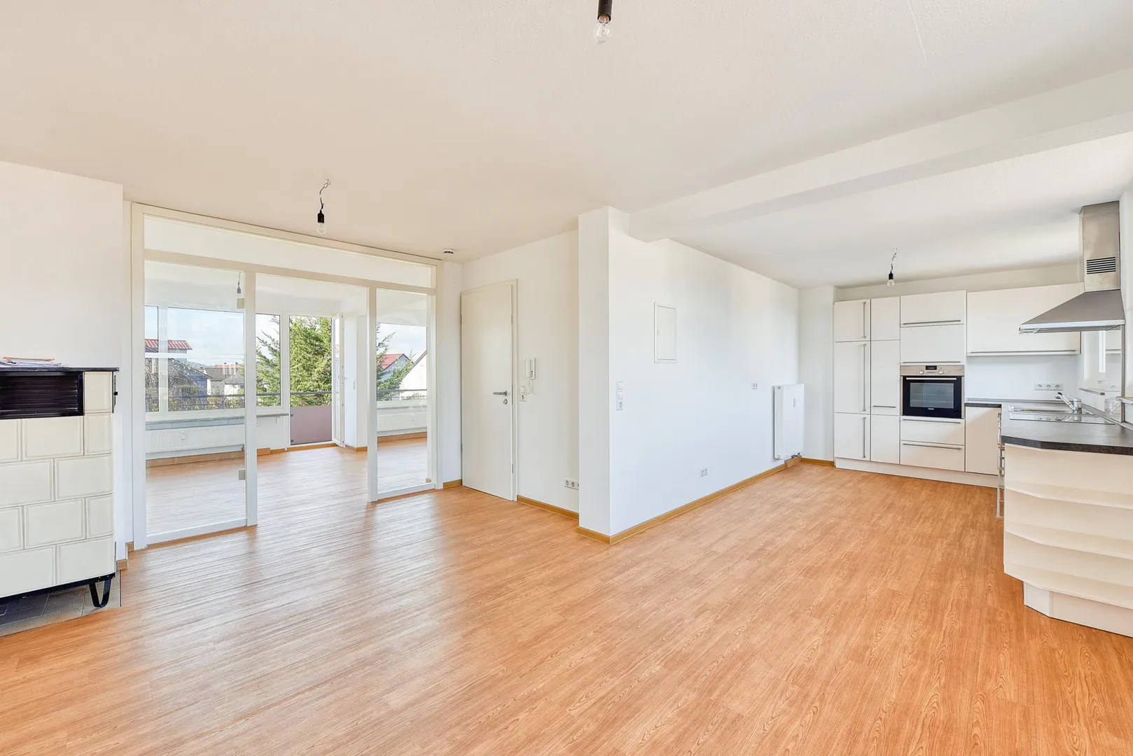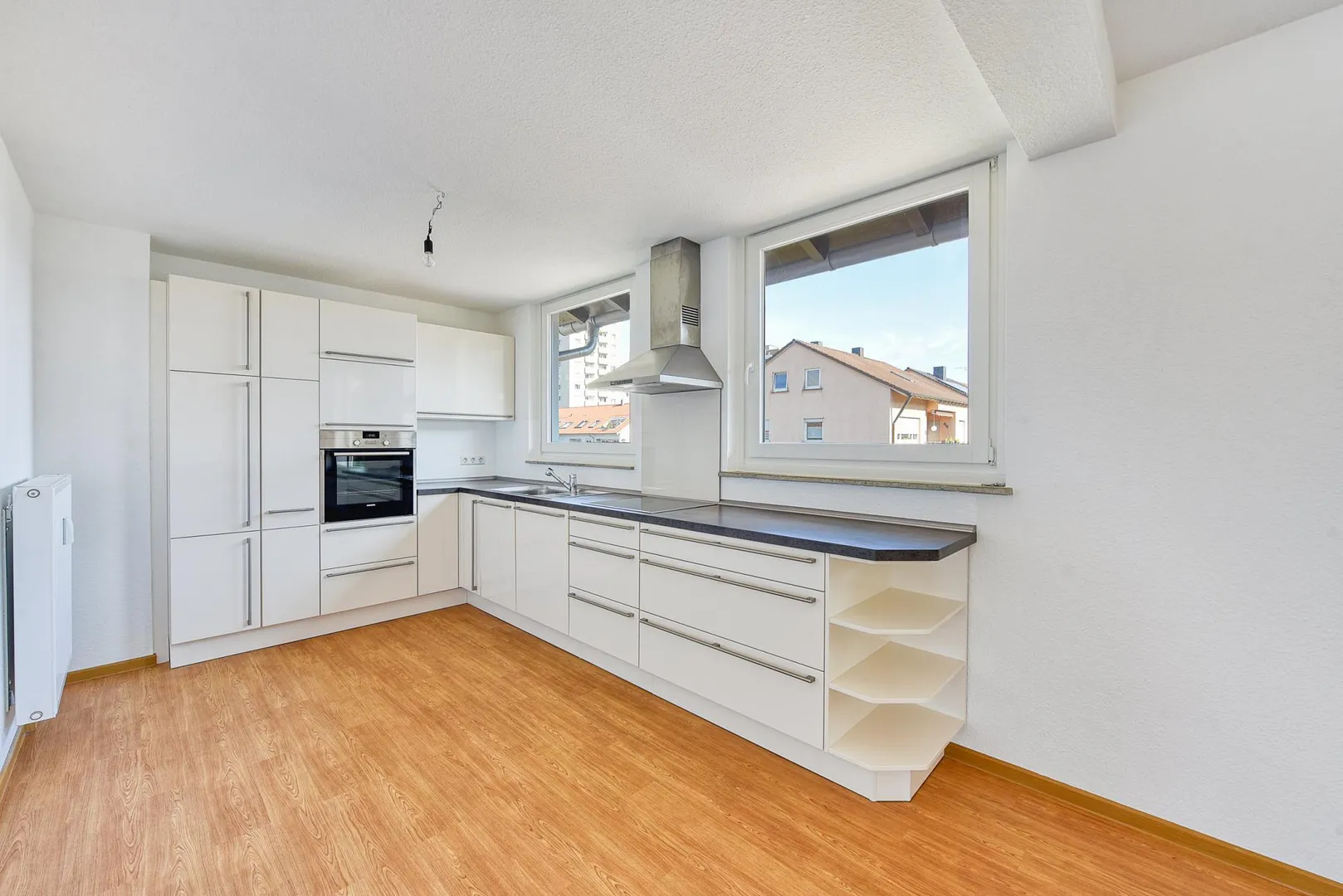 Eine hochwertige Einbauküche wurde 2015 eingebaut und beinhaltet ein Ceran-Kochfeld mit Dunstabzug, einen Backofen, eine Spülmaschine sowie Ober- und Unterschränke. Ein Kühl-/Gefrierschrank wird vom Vermieter nicht gestellt. Die Elektrogeräte sind im funktionsfähigen Zustand. Für die künftige Funktionsfähigkeit der E-Geräte übernimmt der Vermieter keine Haftung.