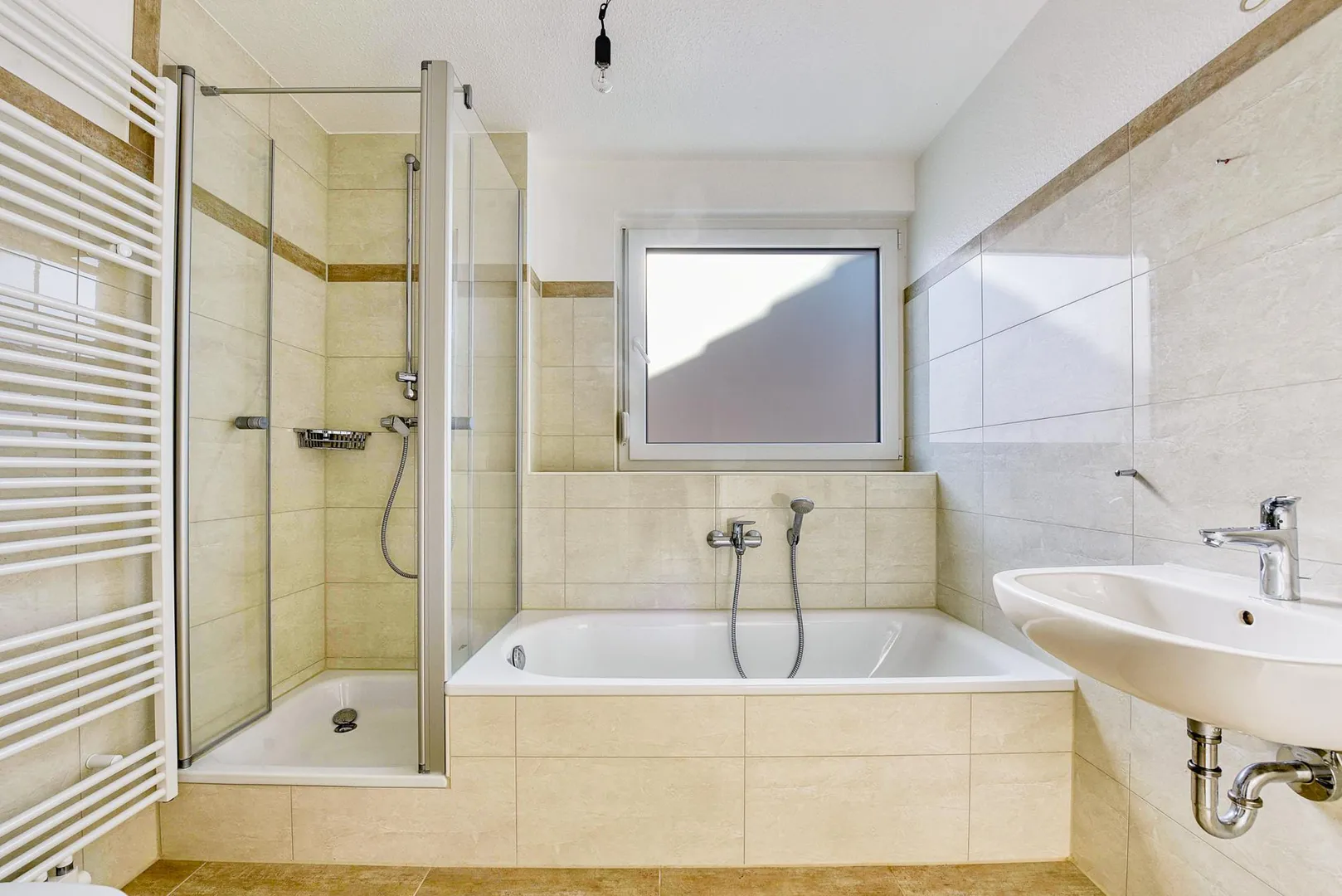 Das ¾ hoch geflieste Tageslicht-Badezimmer ist mit einer Dusche, einer Badewanne, einem Waschbecken, einem WC, einem Handtuchheizkörper, einem Spiegel sowie Fliesenboden ausgestattet.