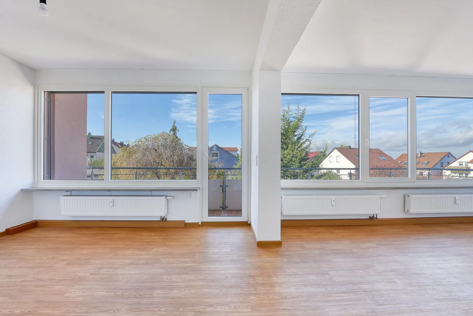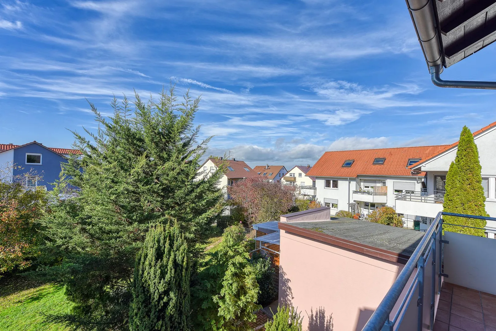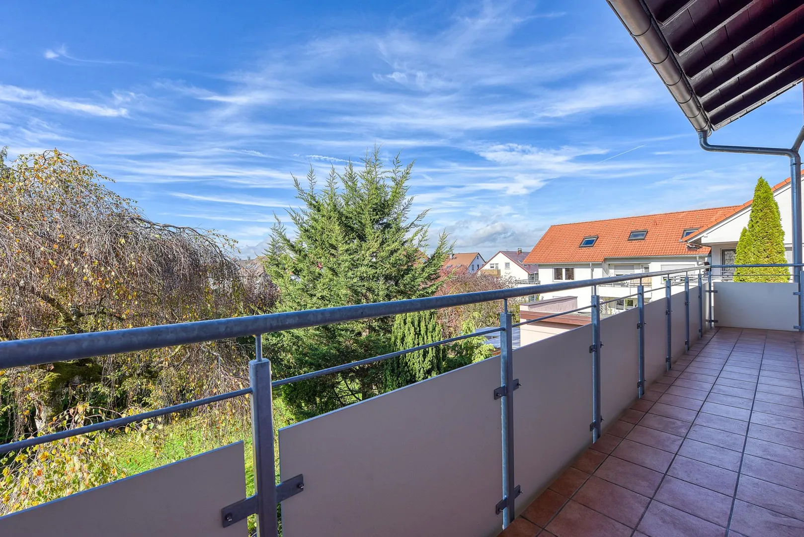 Der ca. 8,9 m² große und überdachte West-Balkon ist über das Wohnzimmer begehbar.