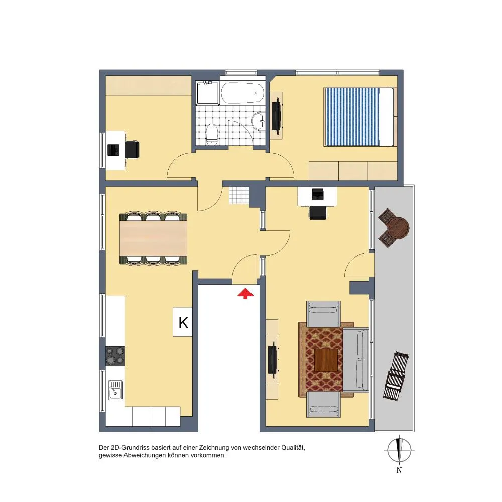 Der Grundriss ist gut und offen gestaltet. Alle Räume sind vom Eingangsbereich begehbar. Das Badezimmer verfügt über ein Fenster.