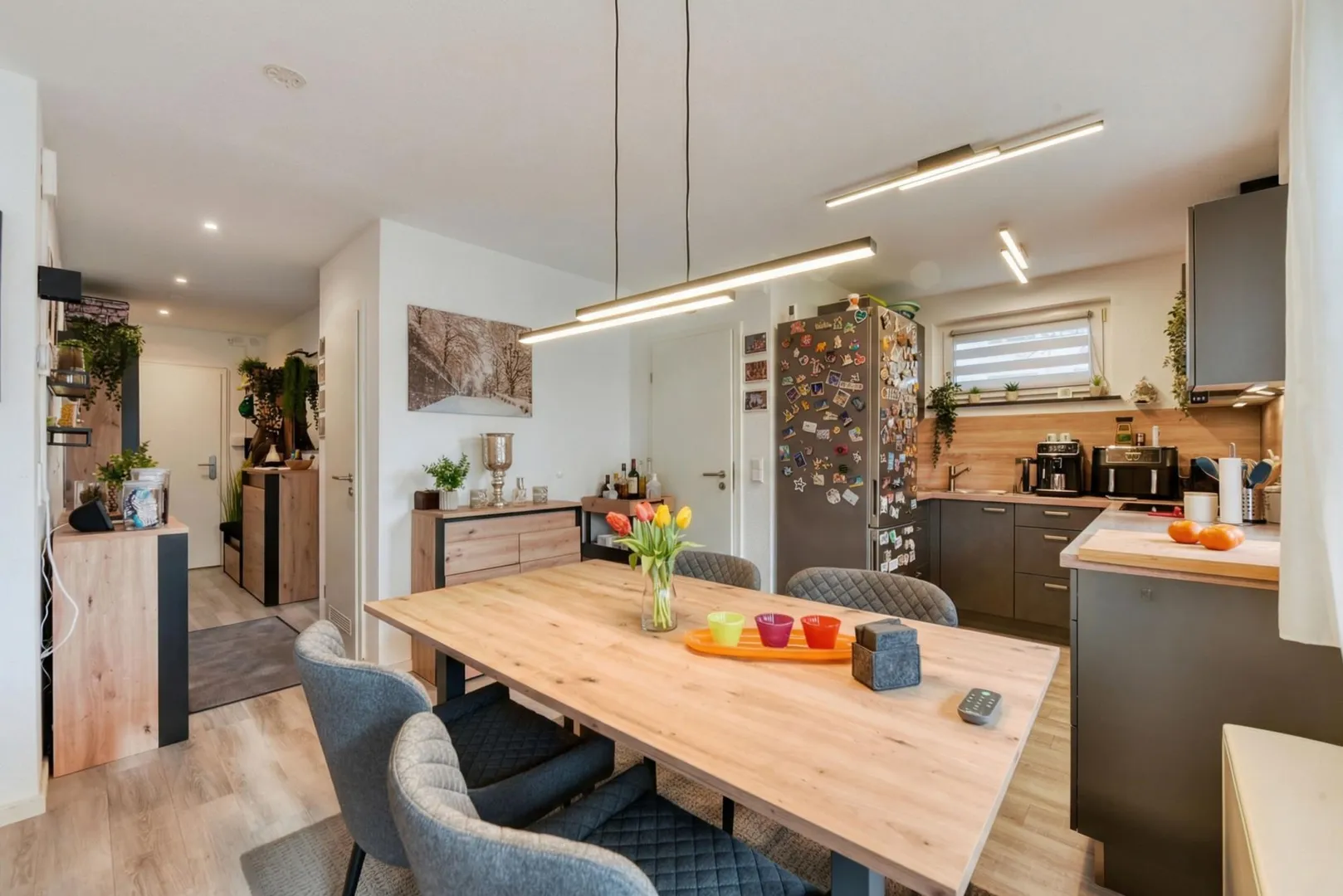 Im offenen Bereich sowie in den Zimmern wurde Vinyl-Design-Boden verlegt. Die Böden im Badezimmer sowie im WC sind gefliest.