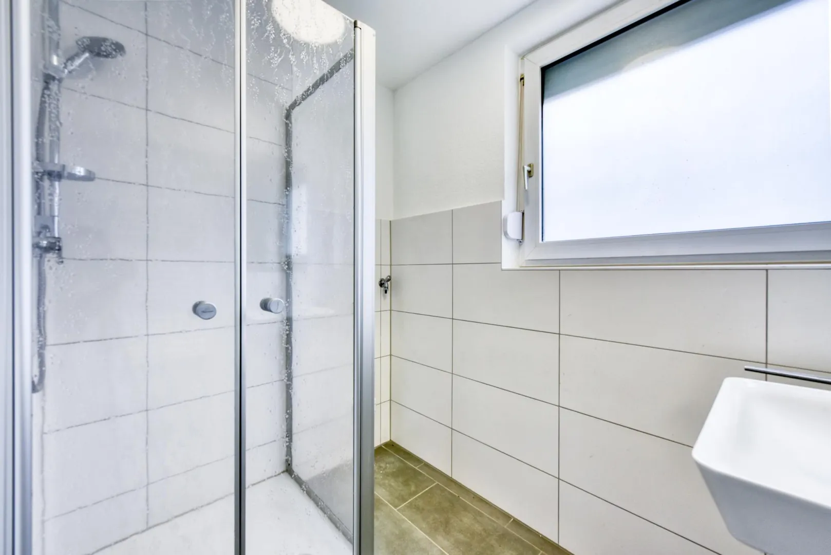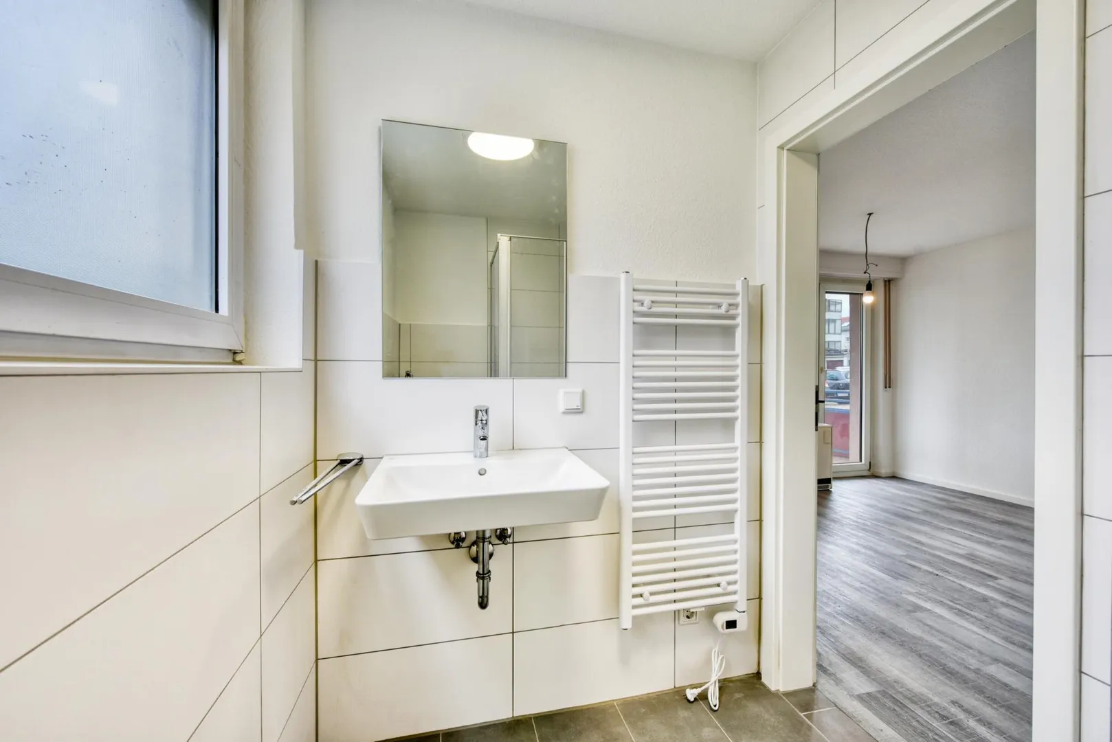 Das Tageslicht-Badezimmer ist ausgestattet mit einer Dusche, einem Handtuch-Heizkörper, einem Waschmaschinen-Anschluss sowie mit einem Spiegel. Der Duschbereich ist raumhoch gefliest.