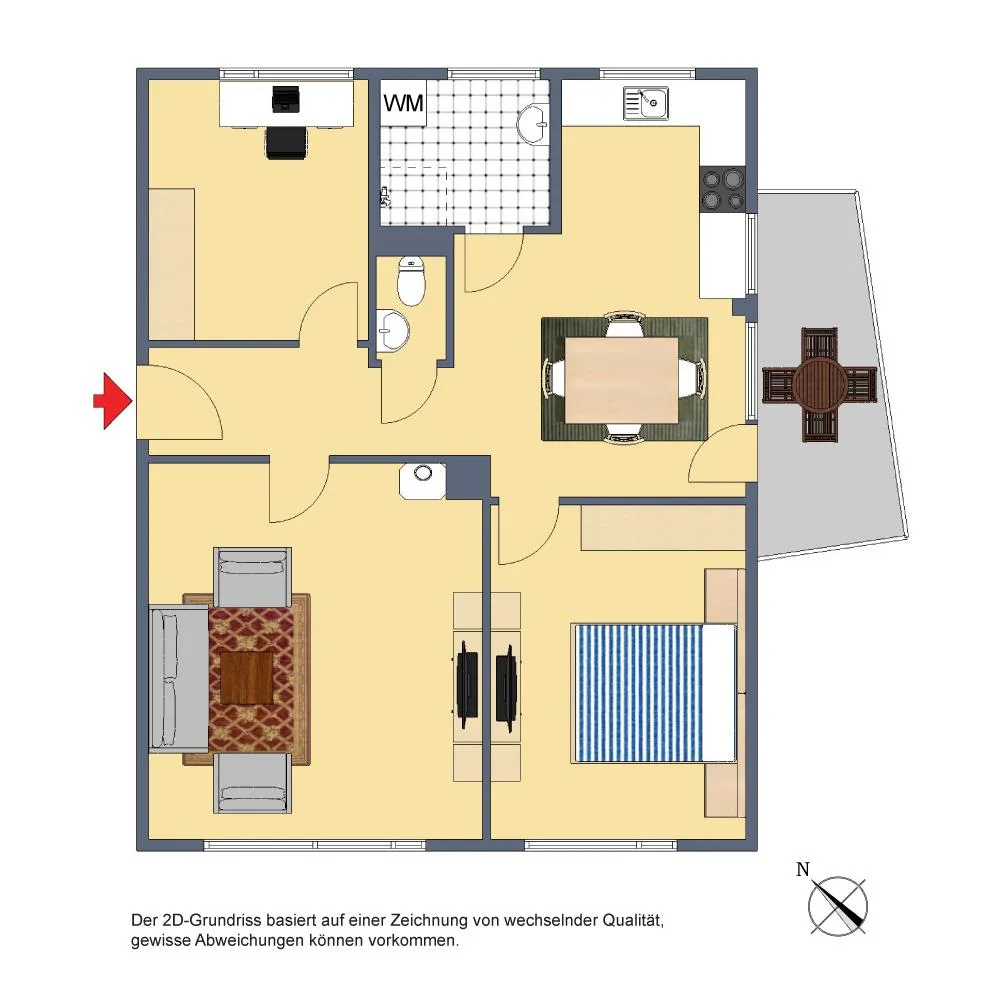 Der Grundriss ist gut und offen gestaltet: alle Räume sind direkt vom Flur begehbar. Das Badezimmer verfügt über ein Fenster. Das WC ist separat. Die Küche ist zum Ess-/Dielenbereich offen. Der Balkon ist über den Essbereich begehbar.