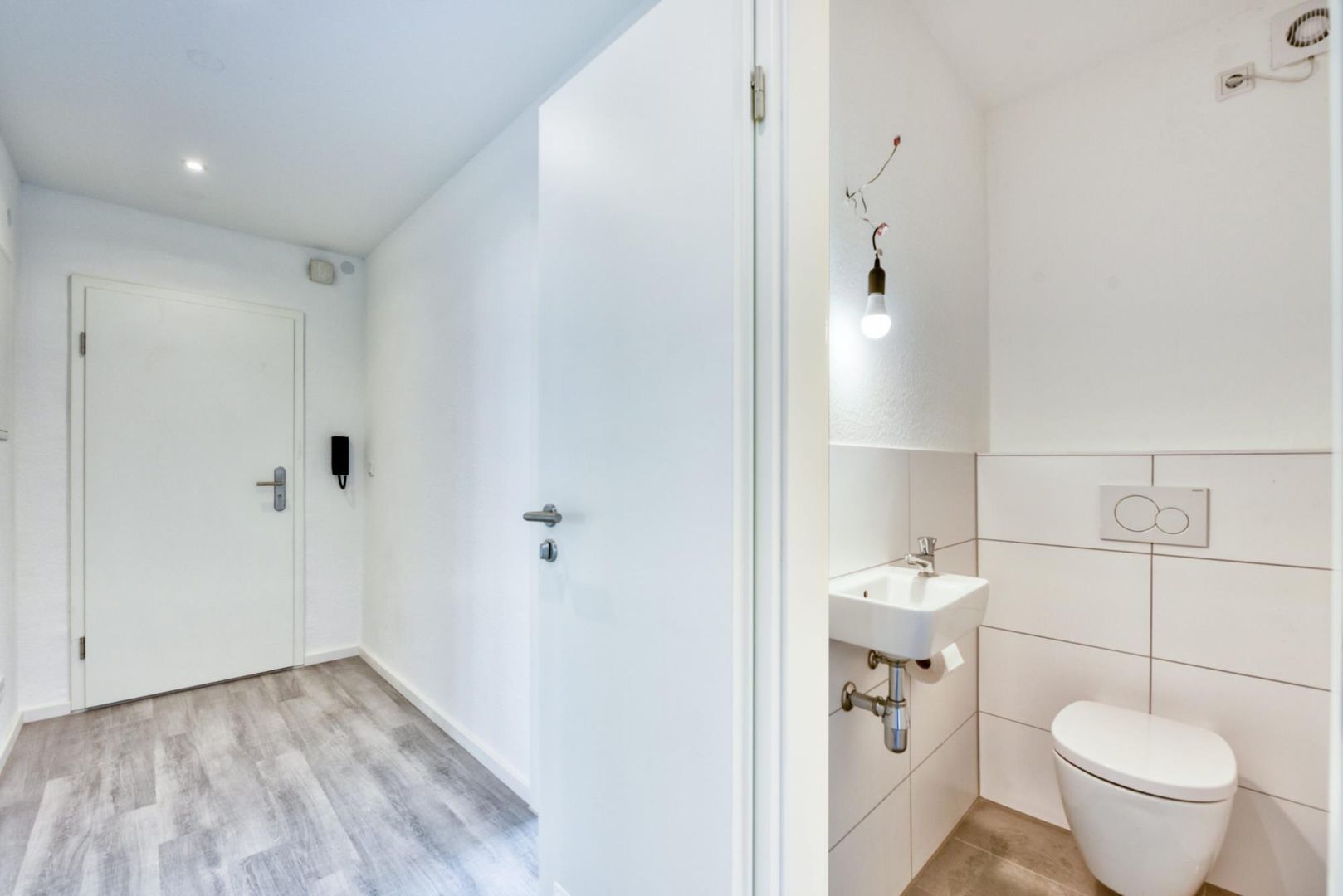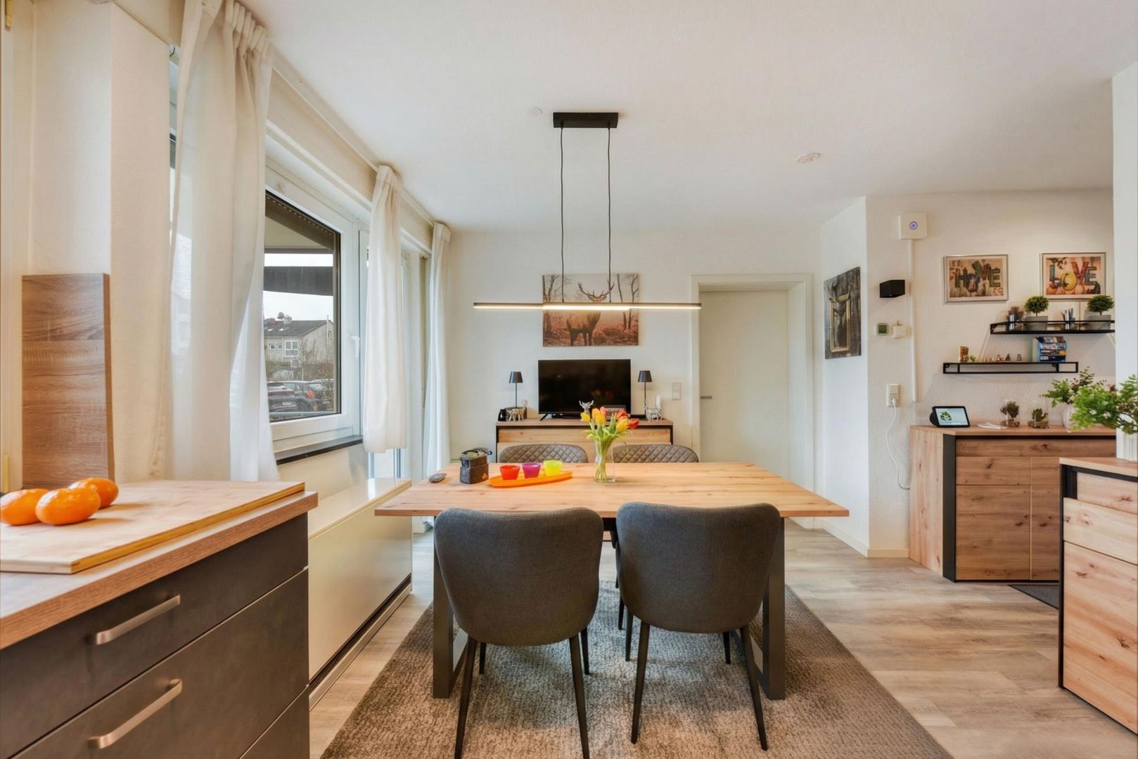 Im offenen Bereich sowie in den Zimmern wurde Vinyl-Design-Boden verlegt. Die Böden im Badezimmer sowie im WC sind gefliest.