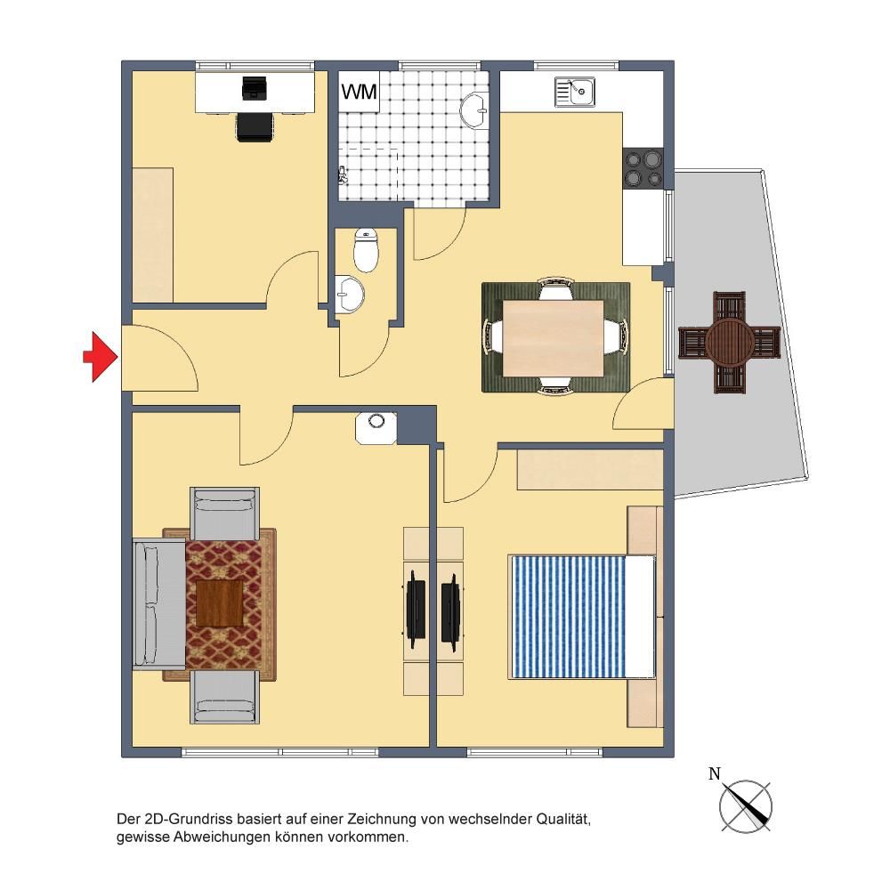 Der Grundriss ist gut und offen gestaltet: alle Räume sind direkt vom Flur begehbar. Das Badezimmer verfügt über ein Fenster. Das WC ist separat. Die Küche ist zum Ess-/Dielenbereich offen. Der Balkon ist über den Essbereich begehbar.