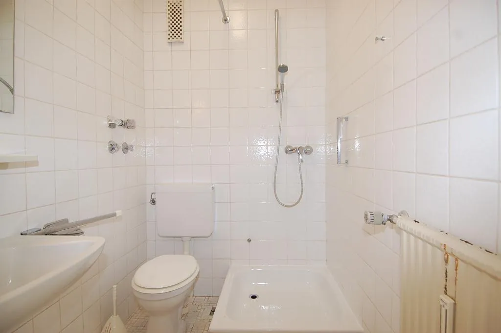 Das Badezimmer ist raumhoch gefliest und verfügt über eine Dusche, ein Waschbecken und ein WC.