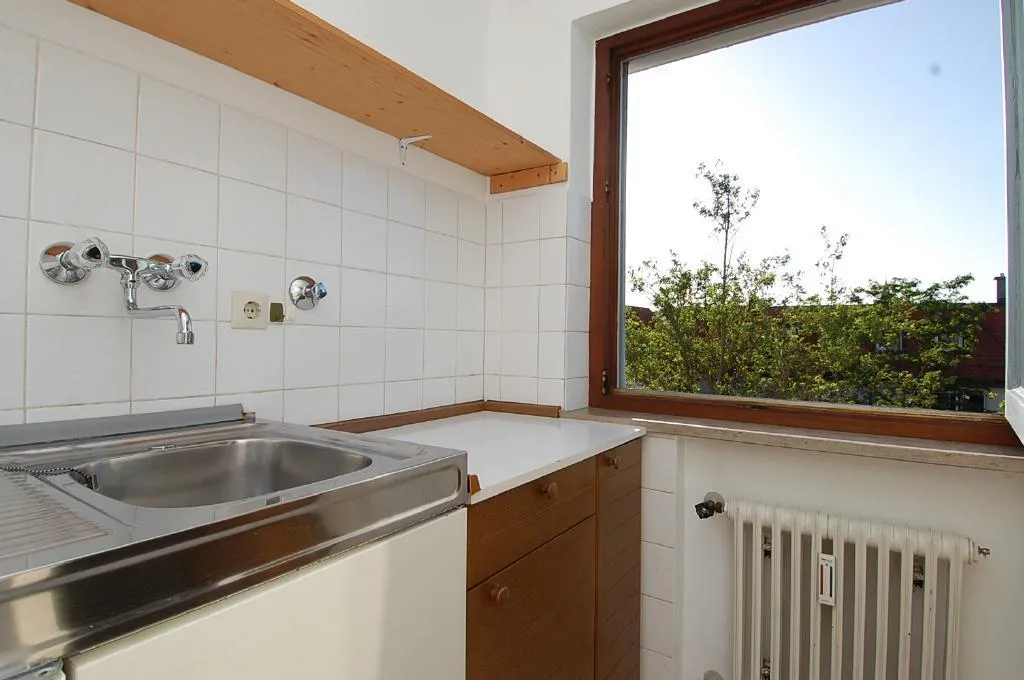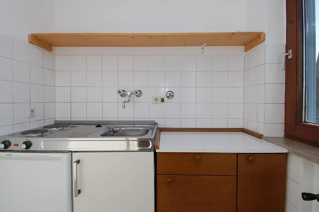 Die Küche ist mit einer kleinen Einbauküche ausgestattet und verfügt über einen Herd und einen Kühlschrank mit Gefrierfach. Eine Spülmaschine ist nicht vorhanden. In der Küche gibt es einen Waschmaschinenanschluss. Bei Bedarf kann dort die Waschmaschine integriert werden.