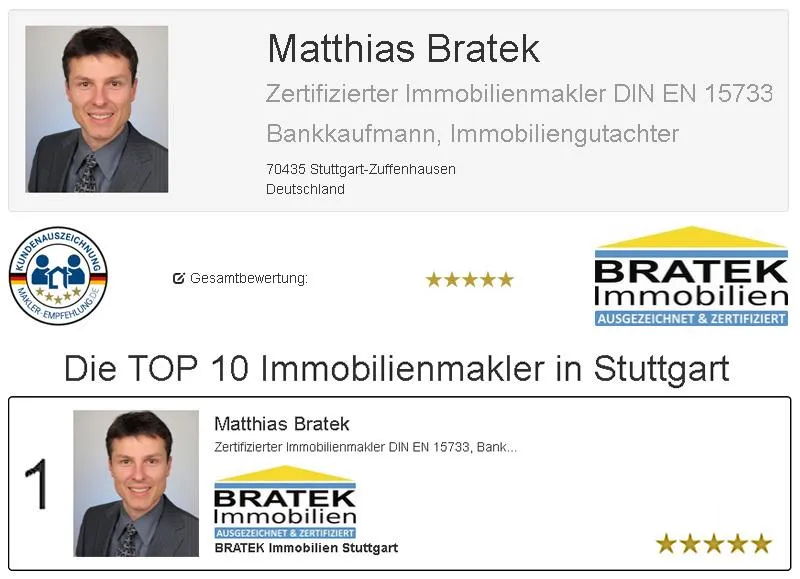 4. BRATEK Immobilien ist ausgezeichnet & zertifiziert. Auszeichnungen: "TOP Immobilienmakler Stuttgart 2015/2013" vom Nachrichtenmagazin "FOCUS", "Best Property Agents 2015/2014/2013" von der Fachzeitschrift "BELLEVUE", "Top 1.000 der Immobilienbranche 2014" von der Wirtschaftswoche. Geschäftsinhaber Matthias Bratek ist der erste zertifizierte Immobilienmakler nach DIN EN 15733 in Stuttgart, Immobiliengutachter und Bankkaufmann. Wir sind Mitglied im Immobilienverband Deutschland.