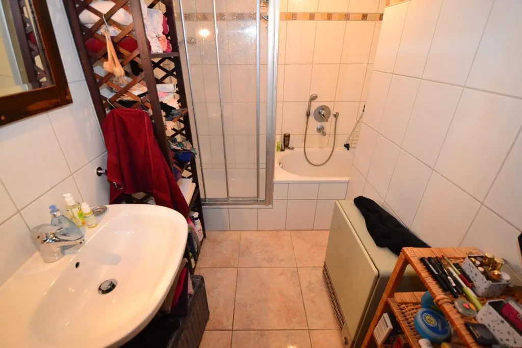 Das raumhoch geflieste Badezimmer ist ausgestattet mit einem Fliesenboden, einer Badewanne sowie einer Dusche. Das geflieste WC ist separat.