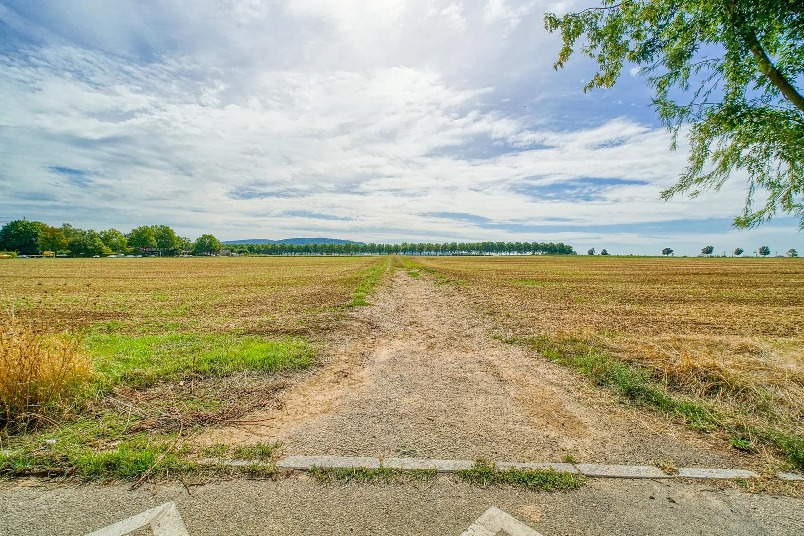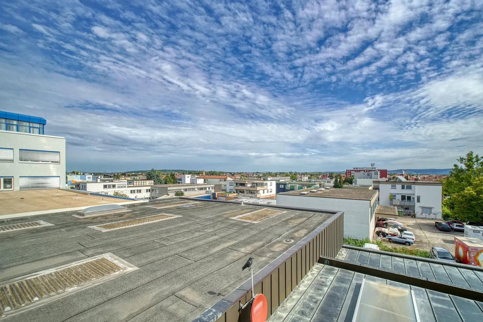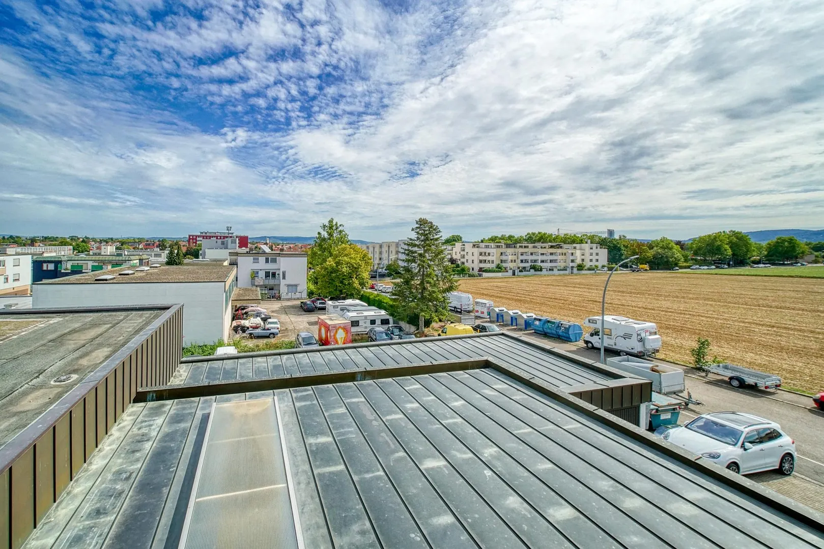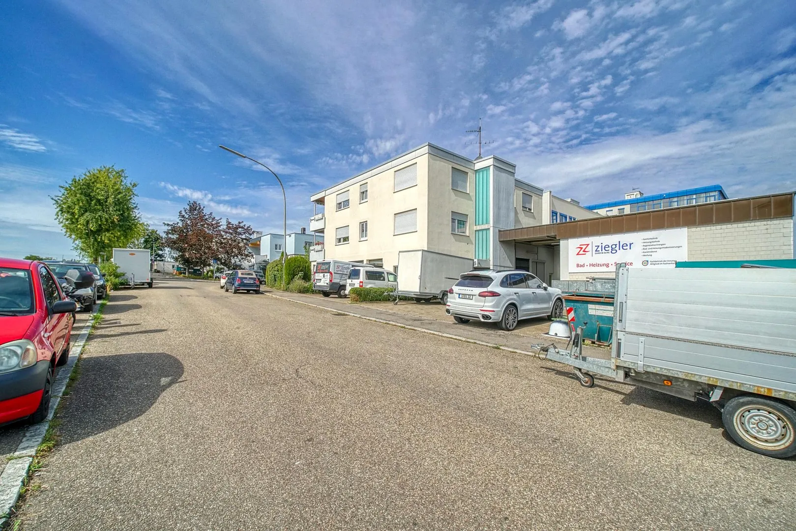 Die Wohnung befindet sich im Gewerbegebiet am Feldrand.