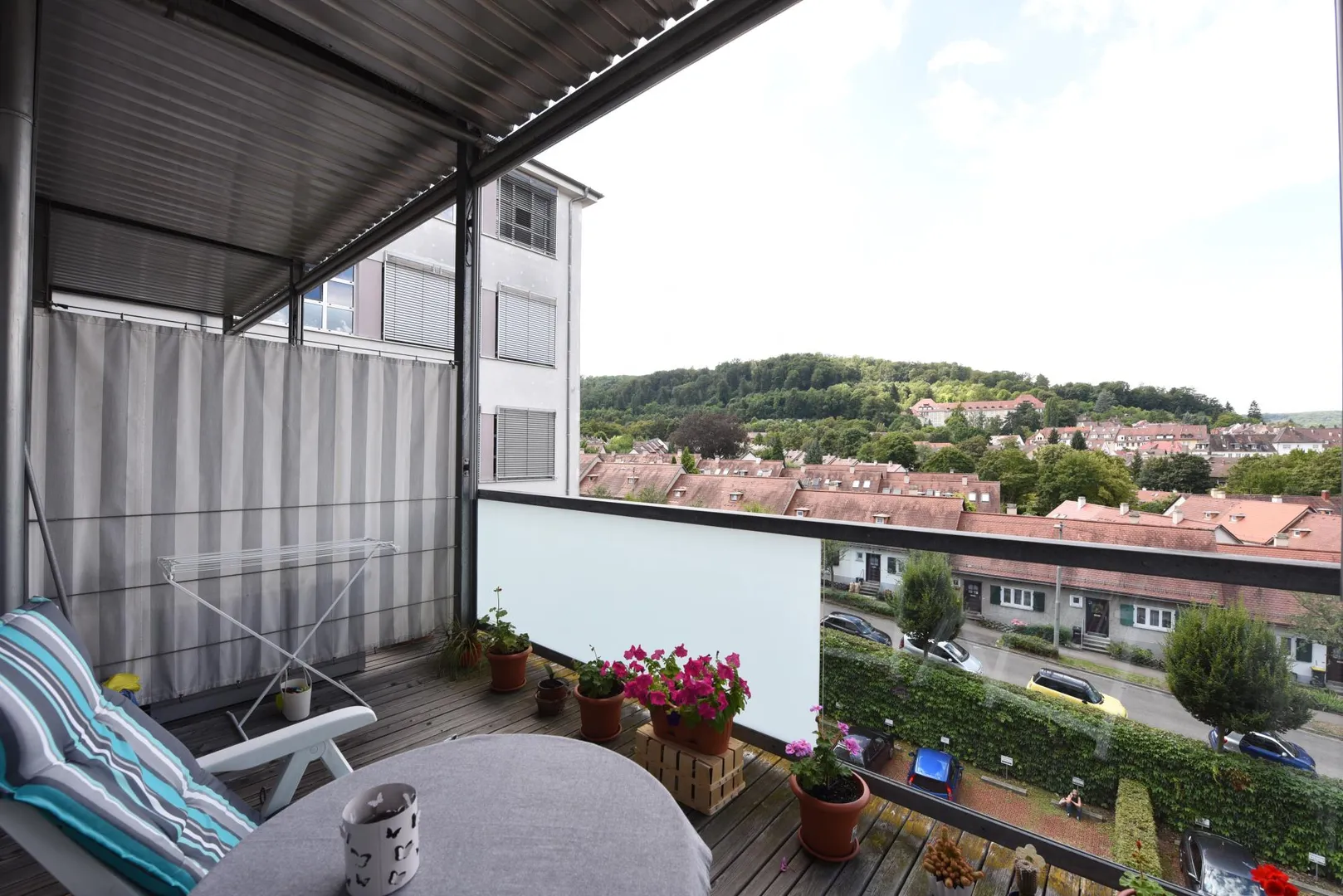 Der ca. 9 m² große und überdachte Balkon ist nach westen ausgerichtet und verfügt über einen schönen Fernblick ins Grüne.