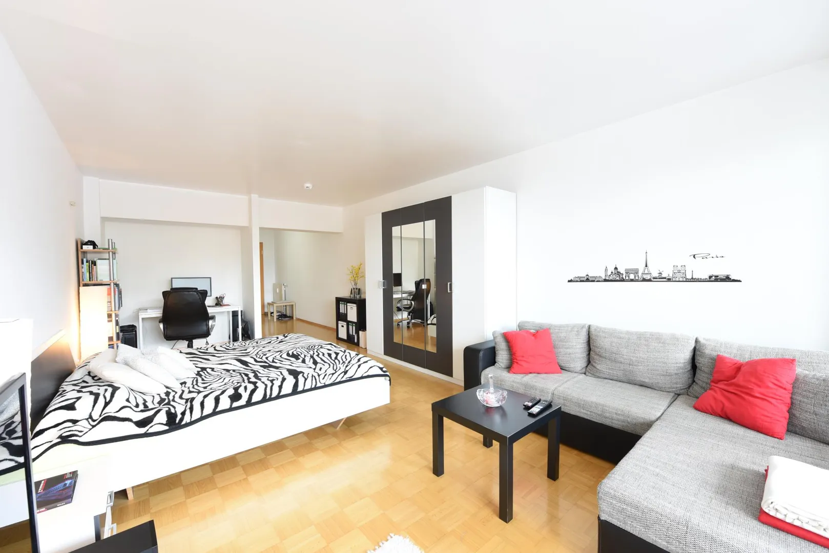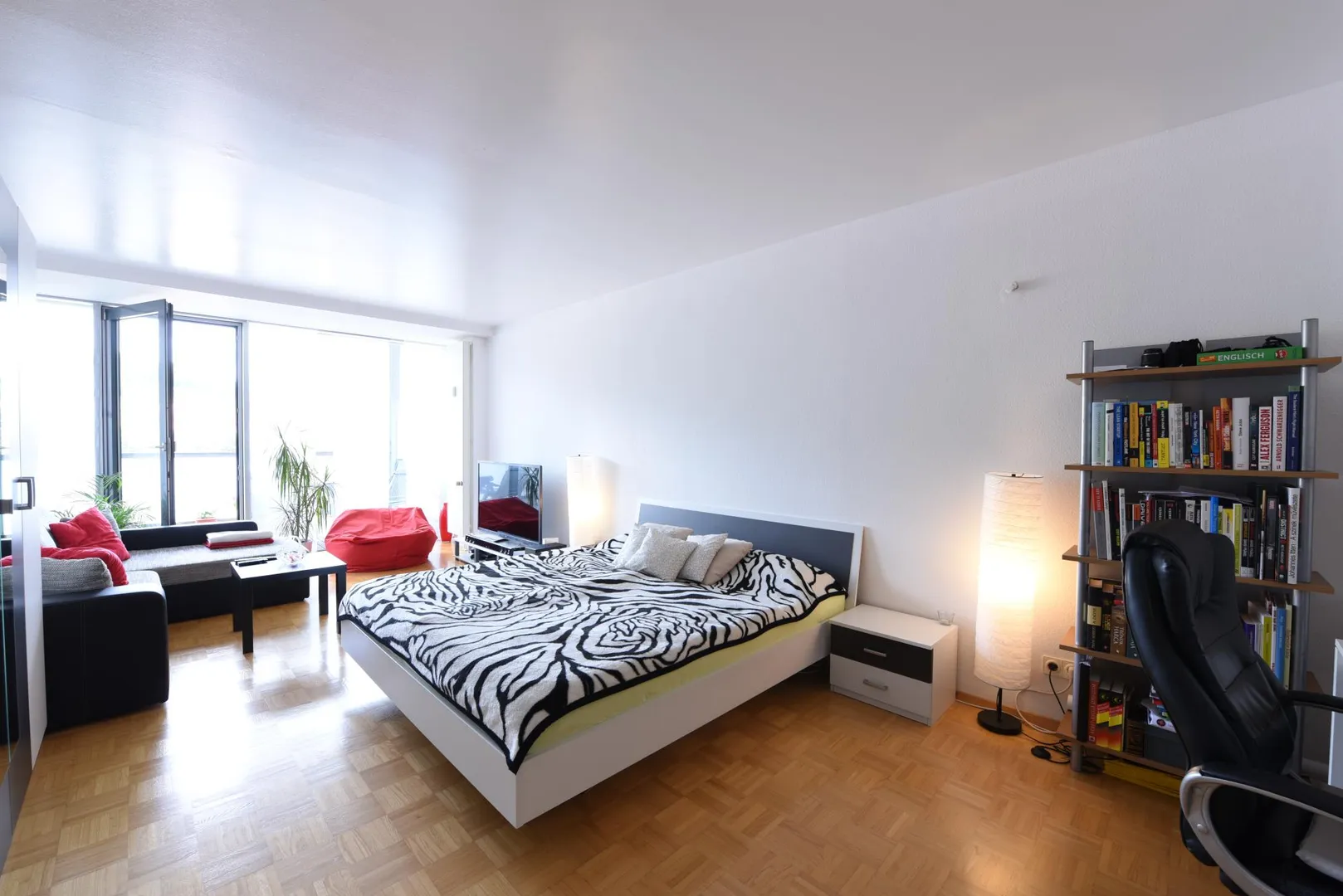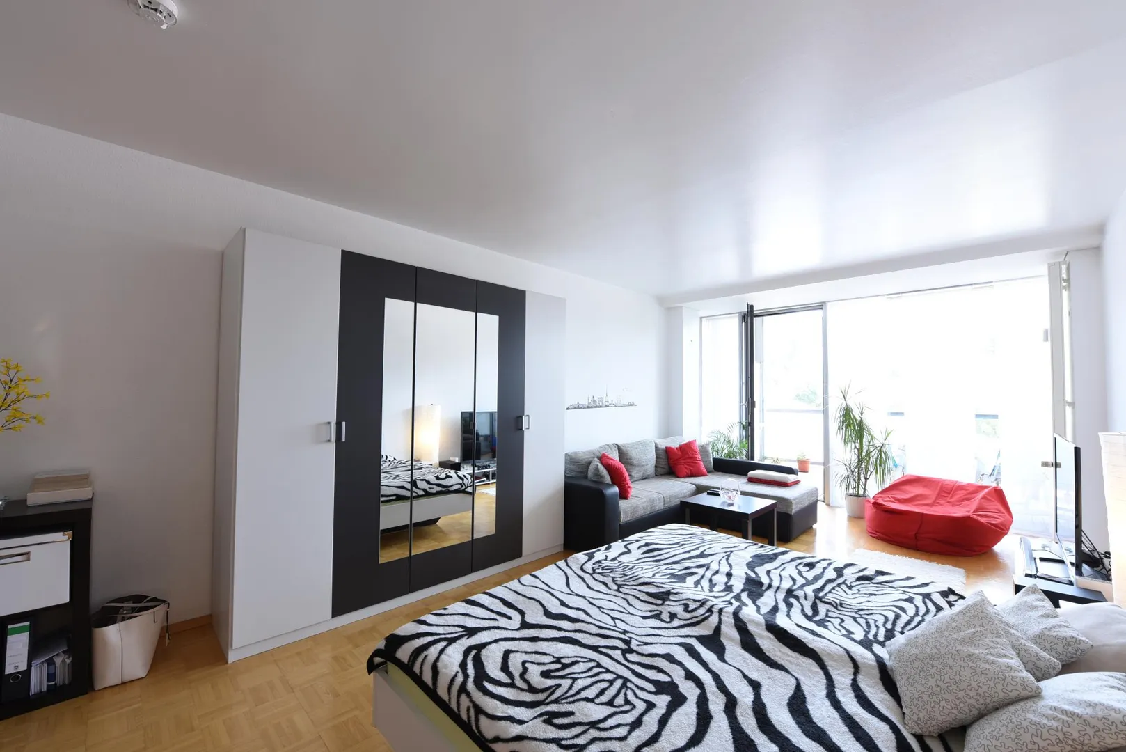 Die Wohnung ist offen gestaltet. Alle Räume bis auf das Badezimmer sind offen.