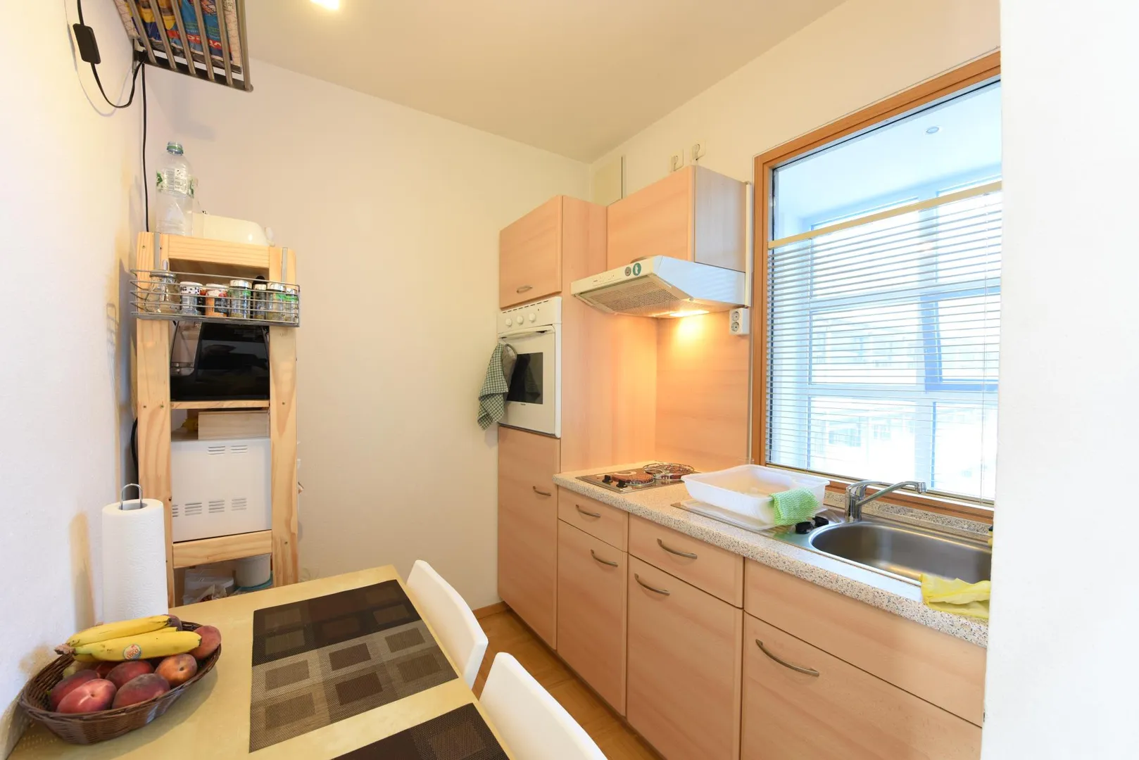 Die Einbauküche verfügt über einen Kühlschrank mit Gefrierfach, einen Herd mit zwei Kochplatten, einen Backofen, einen Dunstabzug sowie Unter- und Oberschränke. Eine Spülmaschine ist nicht vorhanden.