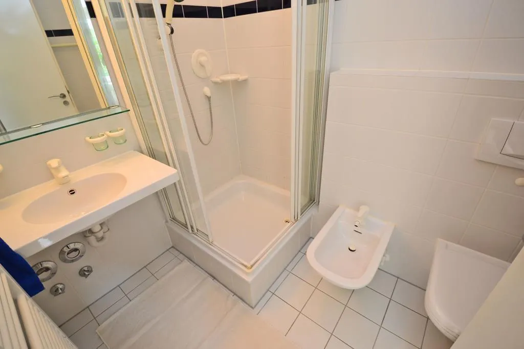 Das raumhoch geflieste Badezimmer ist ausgestattet mit einer Dusche, einem Bidet, einem Handtuchheizkörper, einer Fußbodenheizung und einem WC.