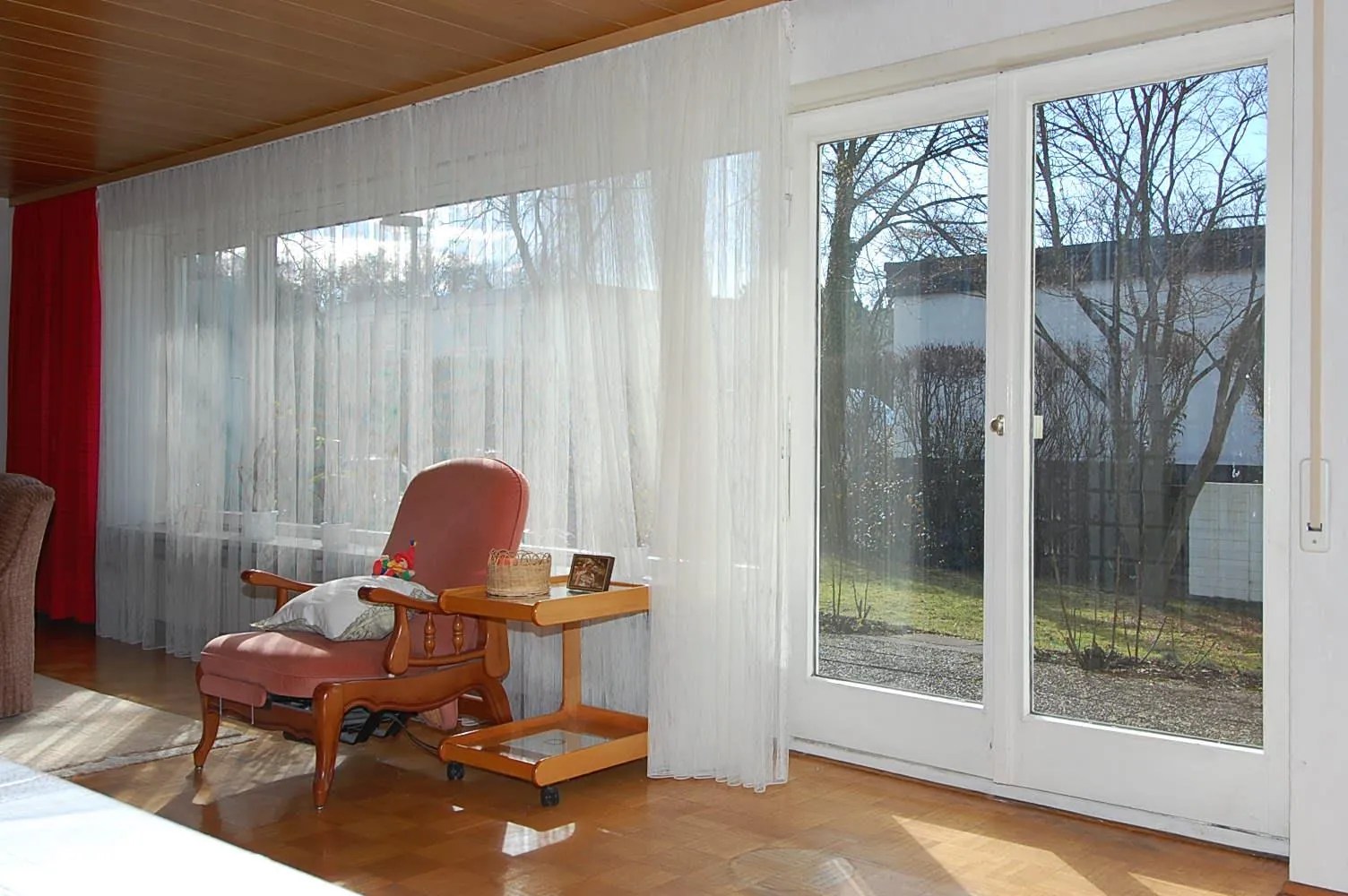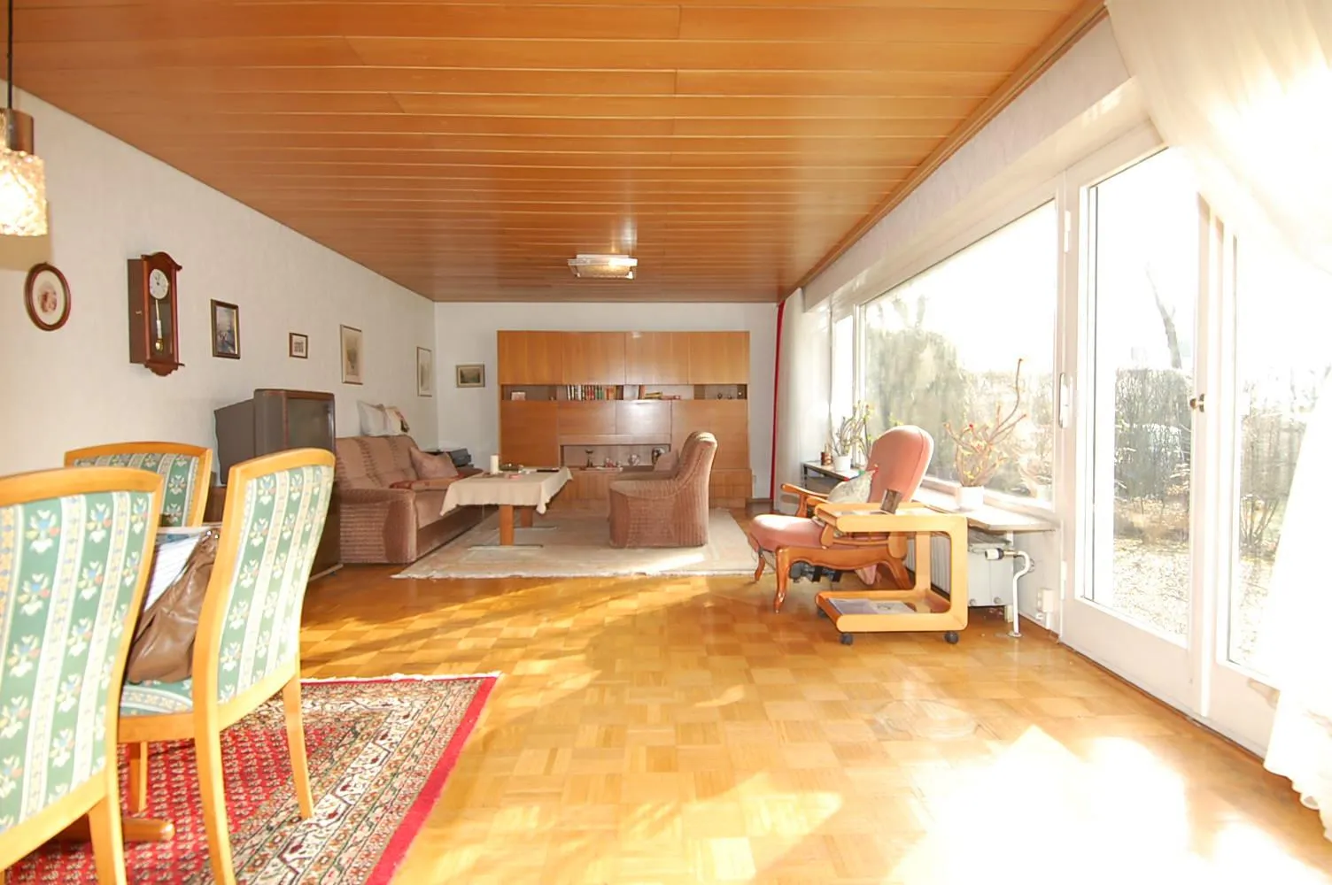 Der Wohn-Essbereich ist ca. 33 m² groß und komplett mit dem ursprünglichen Parkett ausgestattet. Das Parkett im Wohnzimmer kann abgeschliffen werden. Das Wohnzimmer hat zur Terrasse und zum Garten hin eine komplett verglaste Fensterfront. Der Flur ist mit neuwertigem Parkettboden ausgestattet. Der Windfang, das Bad und das separate WC sind gefließt. Die restlichen Zimmer sind mit PVC ausgestattet.