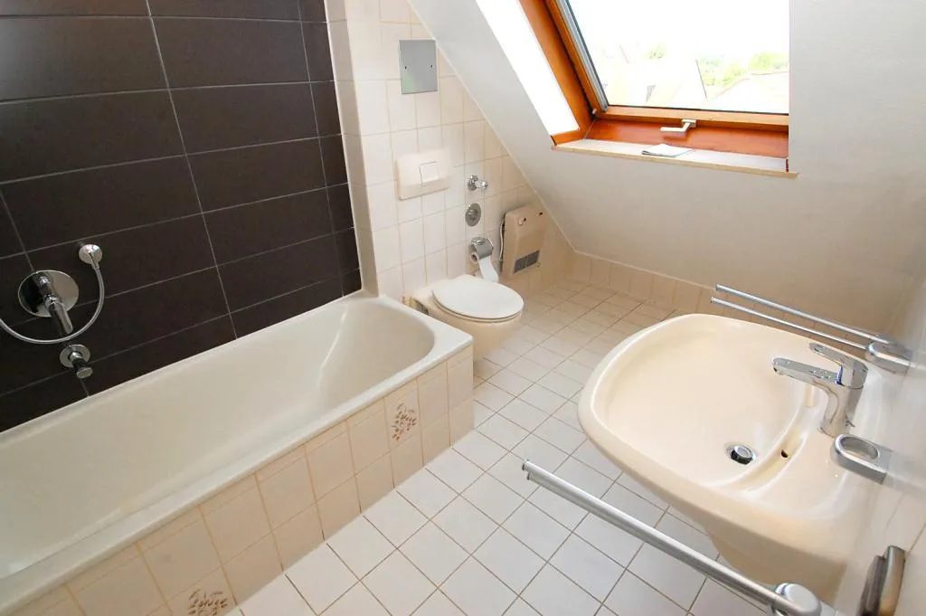 Das raumhoch geflieste Badezimmer mit Fenster ist mit einer Badewanne und einem WC ausgestattet.