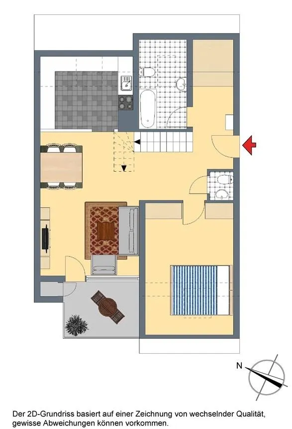 Auf der unteren Ebene befinden sich der offene Wohn-/Ess- und Küchenbereich, die Dachterrasse, ein Schlafzimmer, die Garderobe, das Badezimmer und das separate WC.