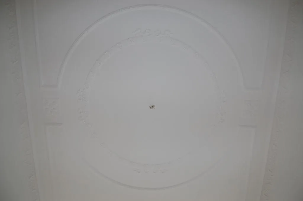 Das Wohn-Esszimmer verfügt über einen Laminatboden, Kunststofffenster, Raufasertapete und original Stuck an der Decke.