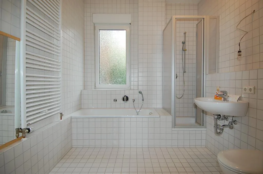 Das Haupt-Badezimmer wurde 2010 modernisiert. Es ist komplett gefliest und verfügt über ein Fenster, eine Wanne, eine Dusche, ein WC, ein Waschbecken, einen Handtuch-Heizkörper und einen Waschmaschinenanschluß.