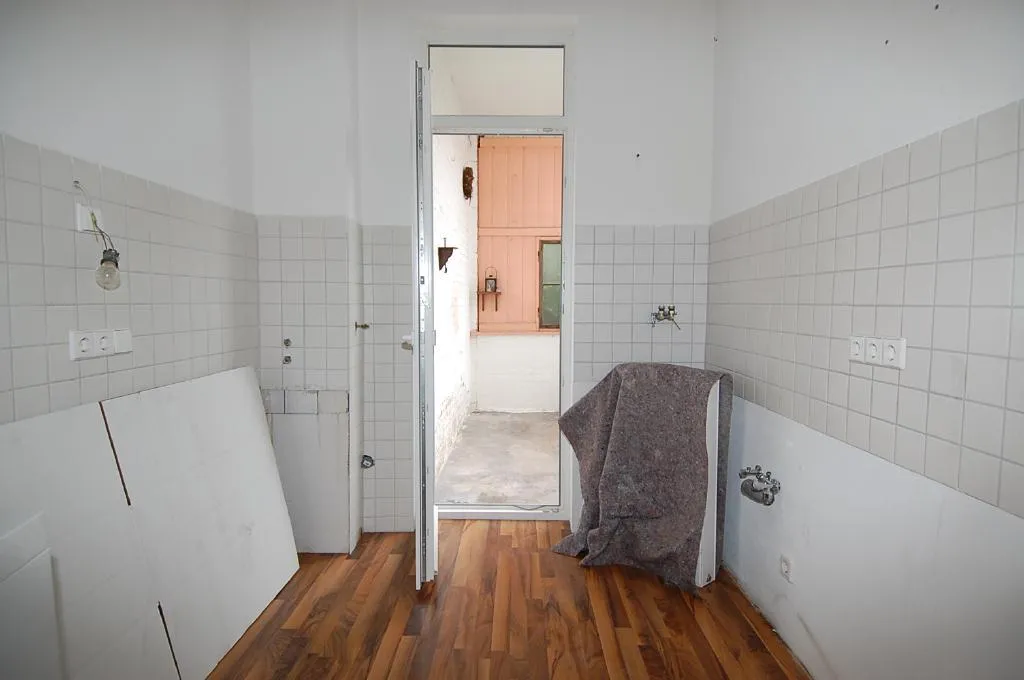 Die Küche verfügt über Laminat, Wandfliesen, Raufasertapete und Ausgang zur überdachten Veranda.