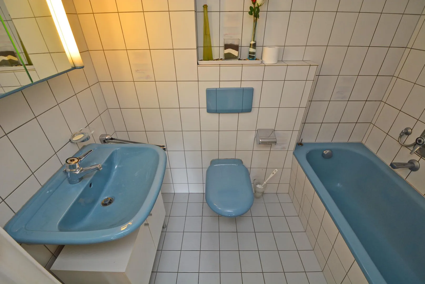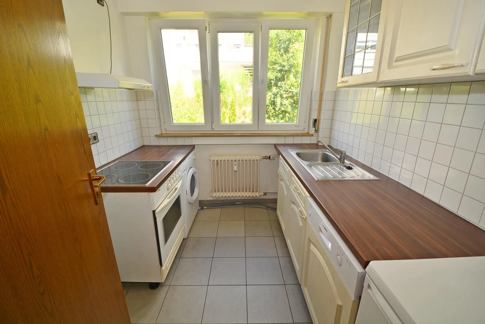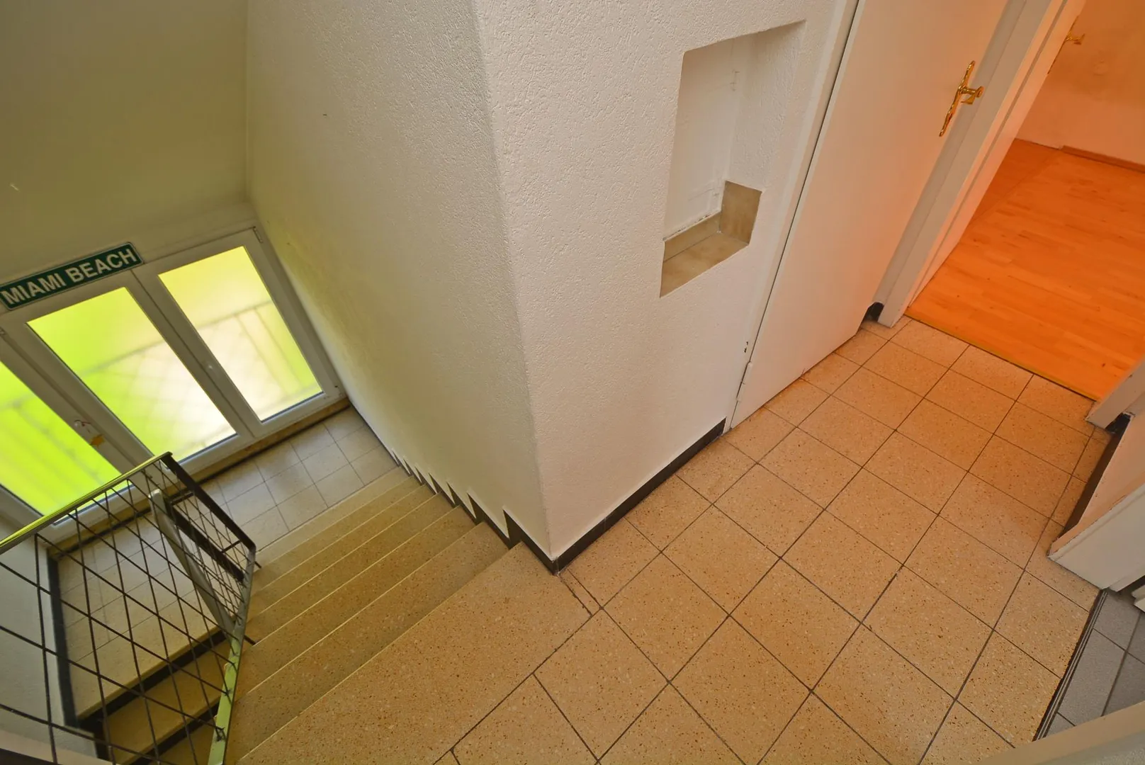 Hochparterre vom Hauseingang: 3-Zimmer-Etagen-Wohnung, ca. 52 m² Wohnfläche, Kunststofffenster mit Rollläden, Wände mit Strukturputz, Parkettböden im Flur und in allen Zimmern, raumhoch gefliestes Bad mit Wanne und WC, Küche mit rustikaler EBK. Kein Balkon. Ein genehmigtes Baugesuch für einen Balkonanbau von 1987 liegt vor. Die Raumhöhen betragen ca. 2,55 Meter.