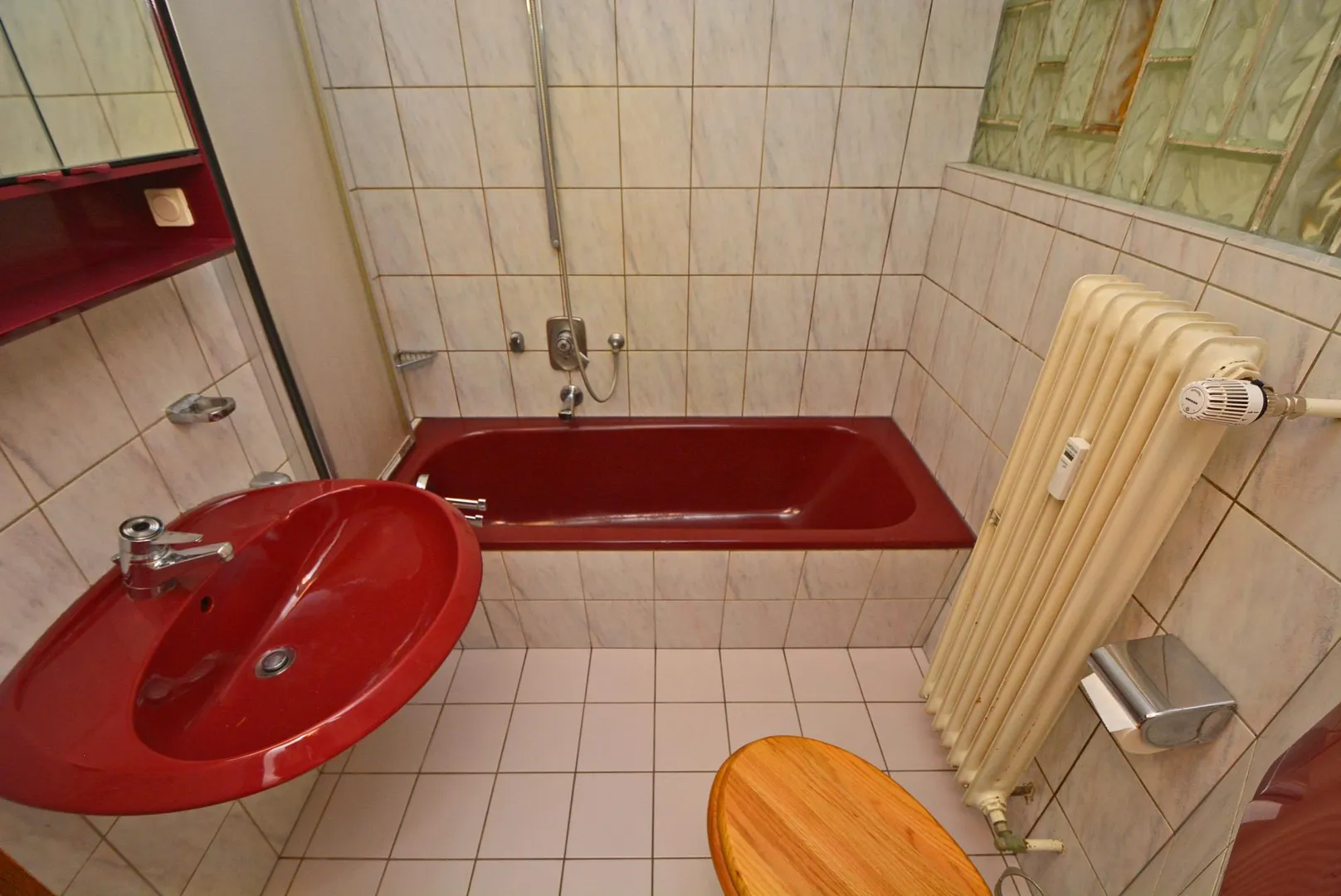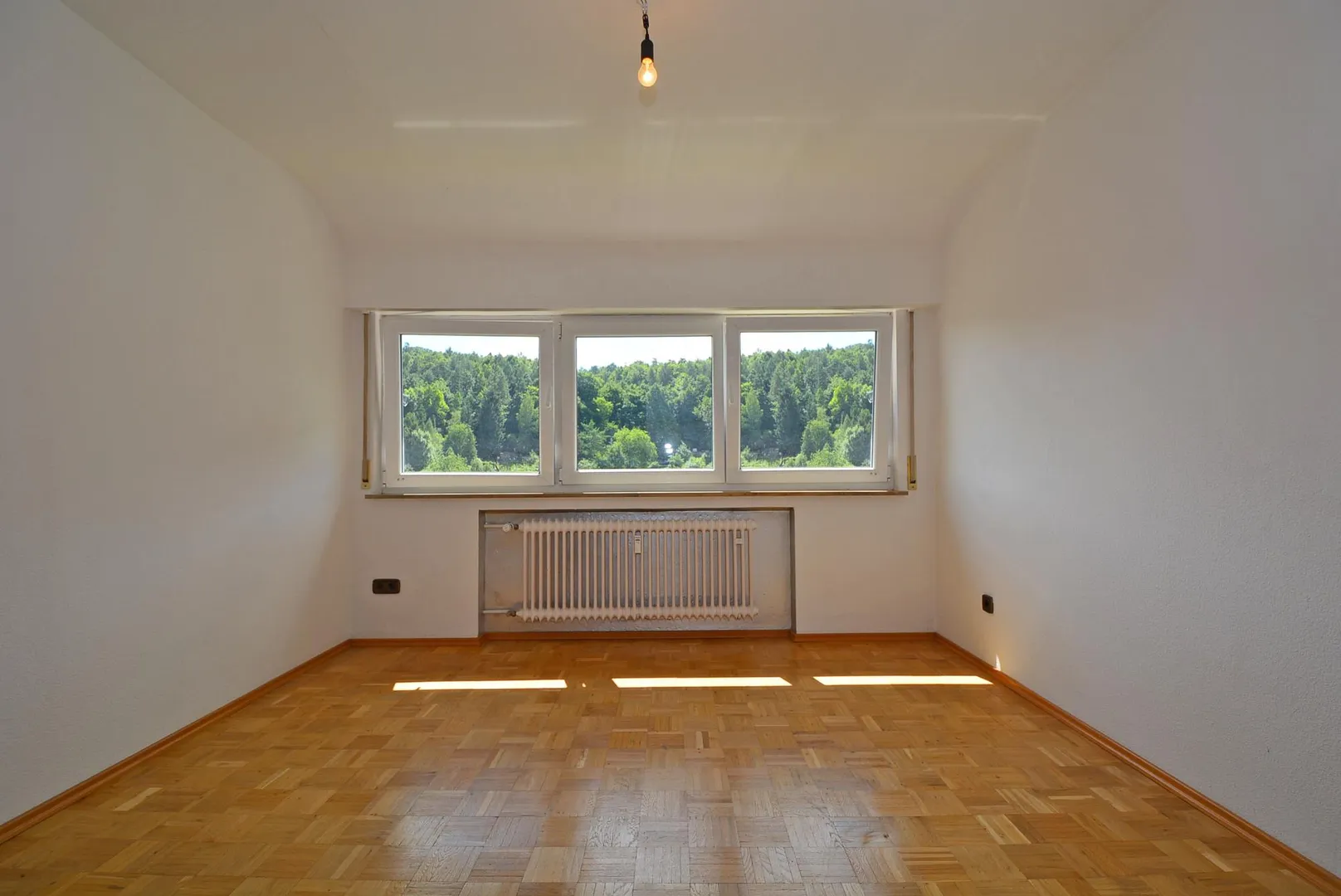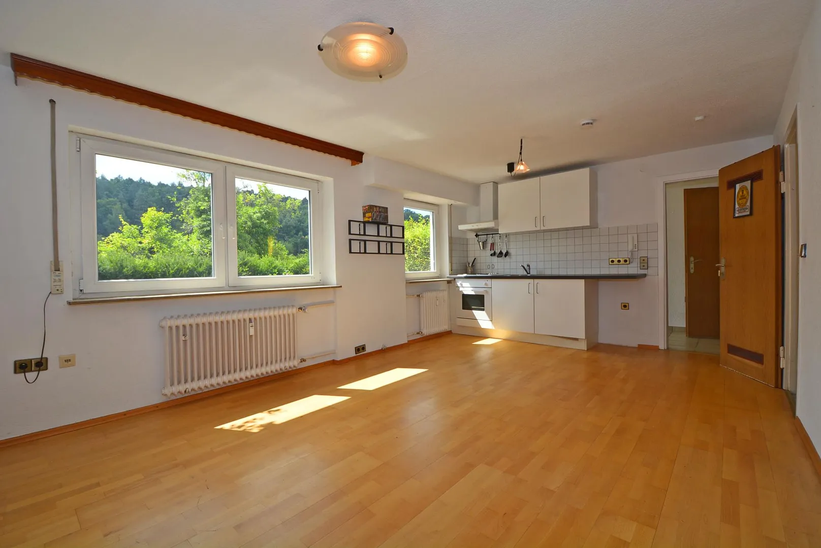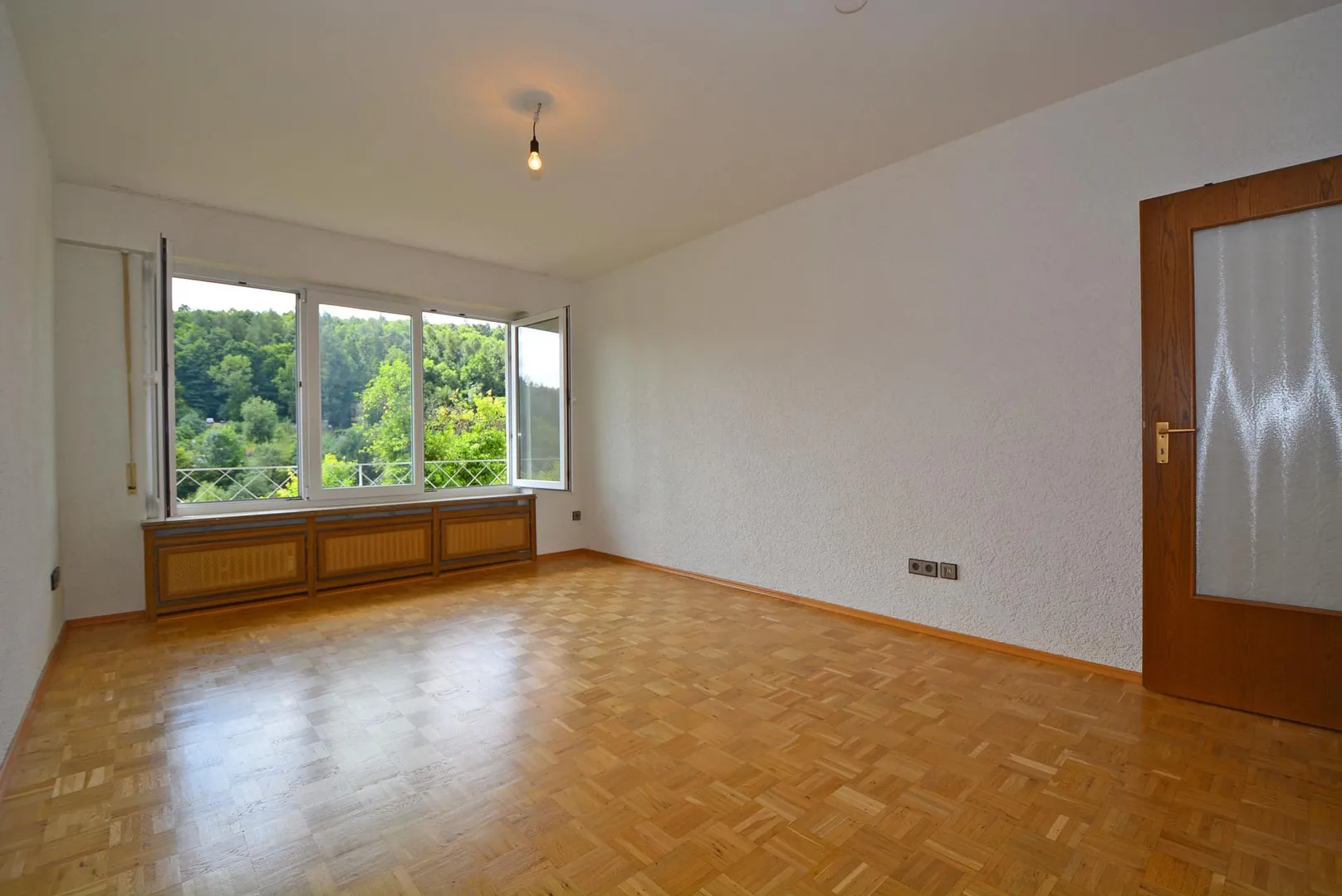 Hochparterre vom Hauseingang: 3-Zimmer-Etagen-Wohnung, ca. 52 m² Wohnfläche, Kunststofffenster mit Rollläden, Wände mit Strukturputz, Parkettböden im Flur und in allen Zimmern, raumhoch gefliestes Bad mit Wanne und WC, Küche mit rustikaler EBK. Kein Balkon. Ein genehmigtes Baugesuch für einen Balkonanbau von 1987 liegt vor. Die Raumhöhen betragen ca. 2,55 Meter.