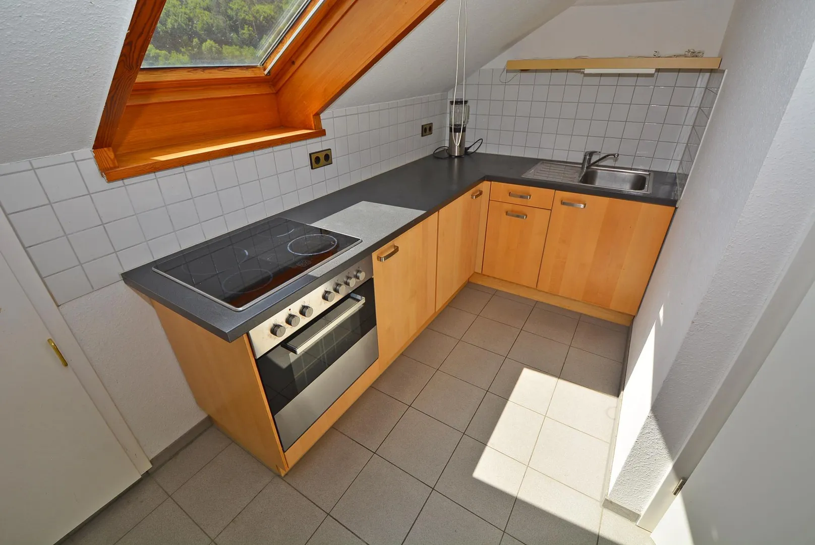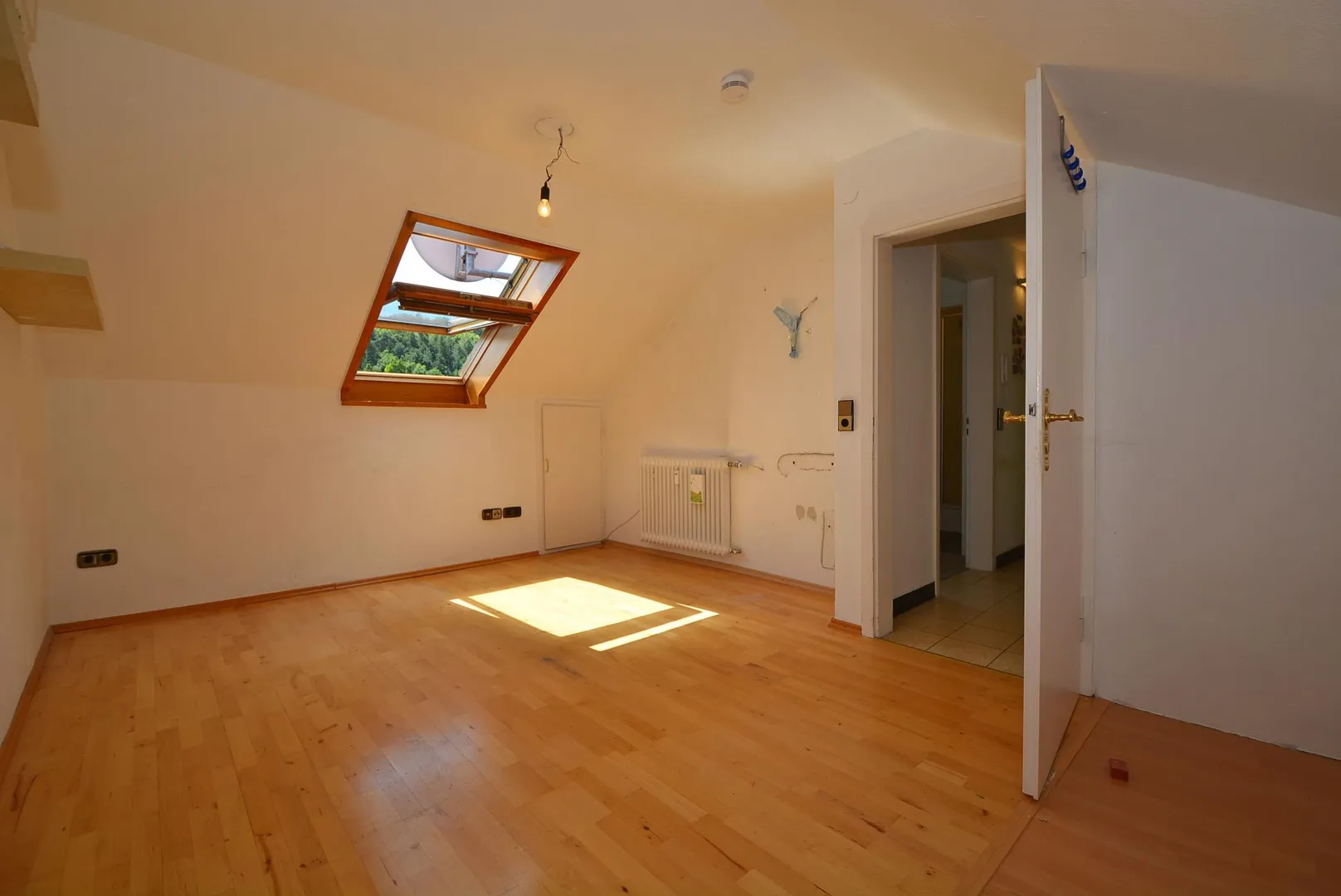 Dachgeschoss: 1-Zimmer-Appartement, mit ca. 17 m² Wohnfläche und ca. 16 m² Nutzfläche, EBK (Baujahr ca. 2010), Fertigparkettboden, Bad mit Dusche (2008/2009), separates WC, Abstellräume in der Wohnung, Dachflächenfenster (1989) in Holz mit Jalousien, Klima-Splitt-Gerät. Raumhöhen ca. 2,30 Meter.