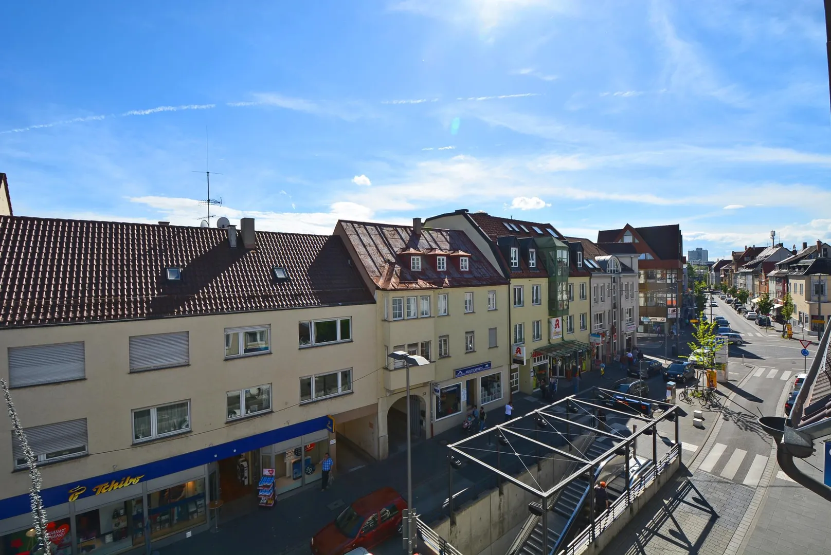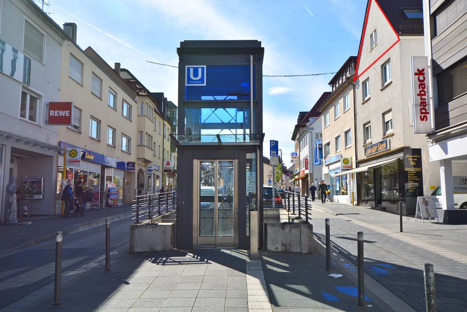 Zahlreiche Einkaufsmöglichkeiten, Banken, Post, Bäcker, Metzger sowie Gastronomie befinden sich in der Straße.