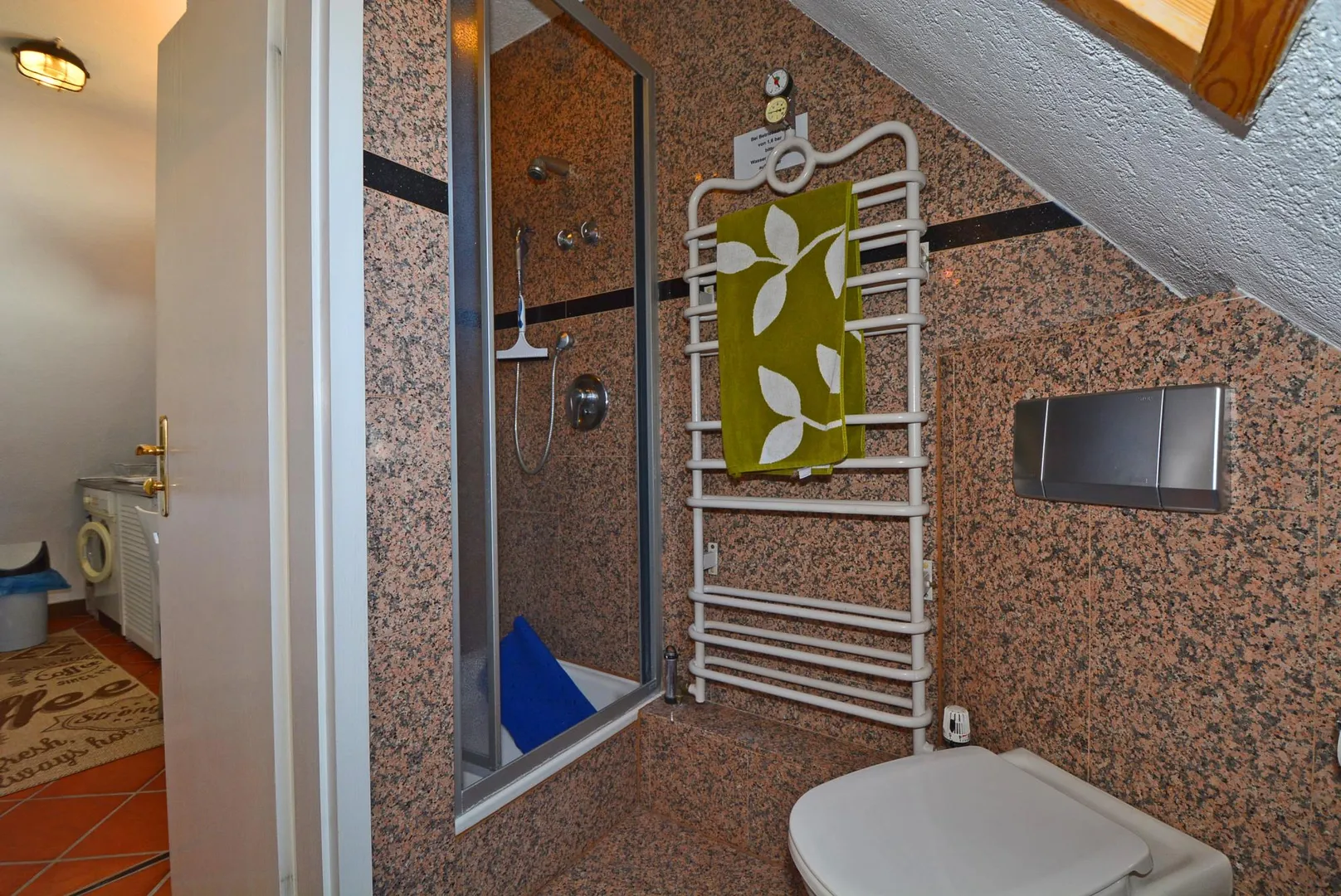 Das raumhoch geflieste Tageslicht-Badezimmer verfügt über eine Dusche, ein WC sowie einen Handtuch-Heizkörper.